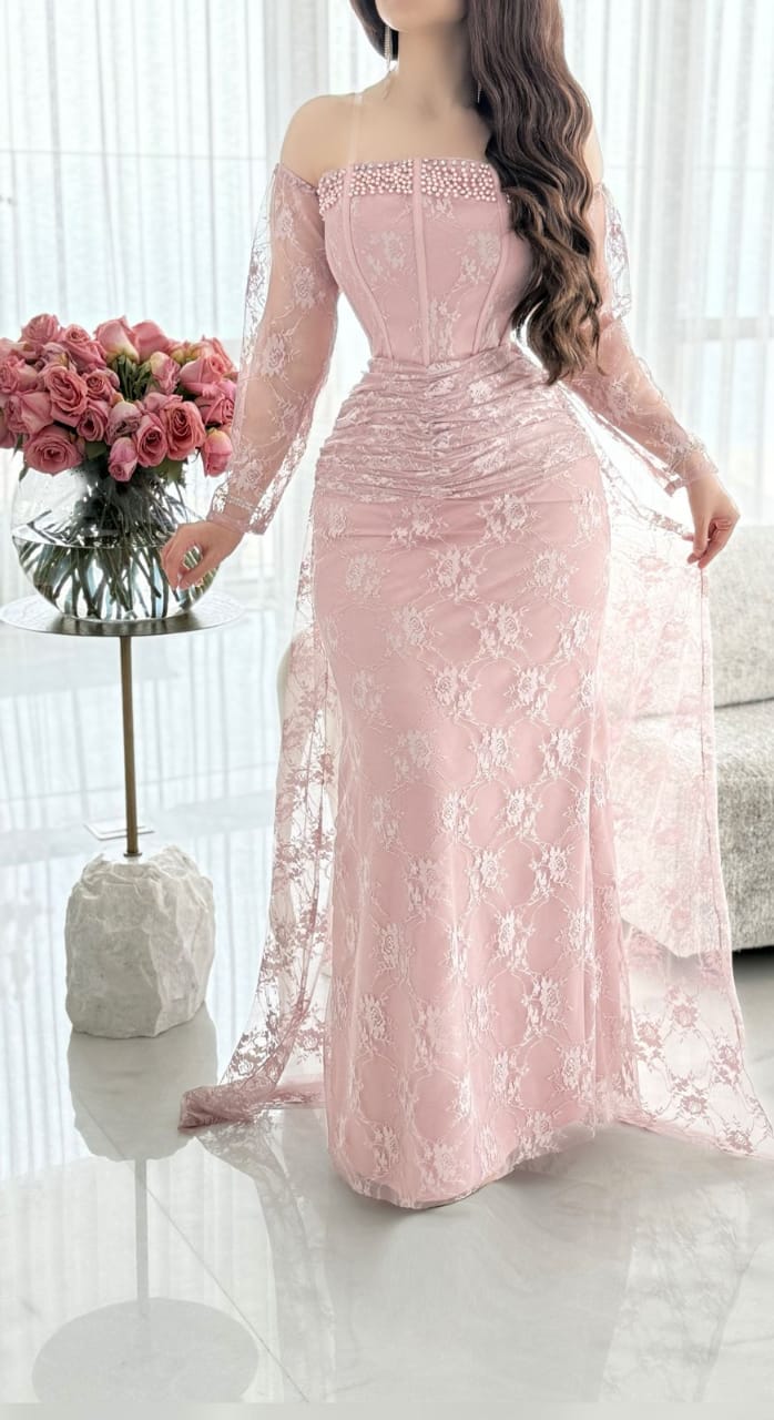 فستان سهرة وردي فاتح طويل بتصميم أنيق
