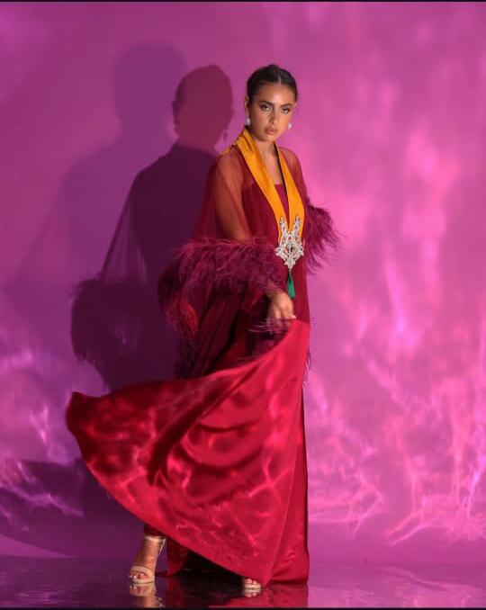 جلابية عنابي فاخر بلمسة شفافة وتفاصيل ريش أنيقة على الأكمام. بتطريز مركزي فاخر وياقة ذهبية تضيف إشراقاً ملكياً لمناسباتك الخاصة.