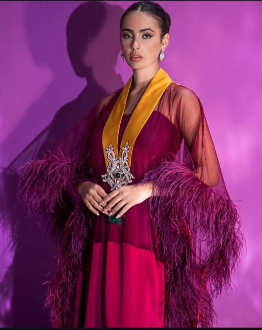 • الألوان والتصميم: يتميز القفطان بدمج جريء وأنيق بين الألوان. الطبقة الداخلية بلون فوشيا غني وجذاب، بينما الطبقة الخارجية شفافة بلون التوتي الداكن (Berry) مصنوعة من قماش التول الناعم.