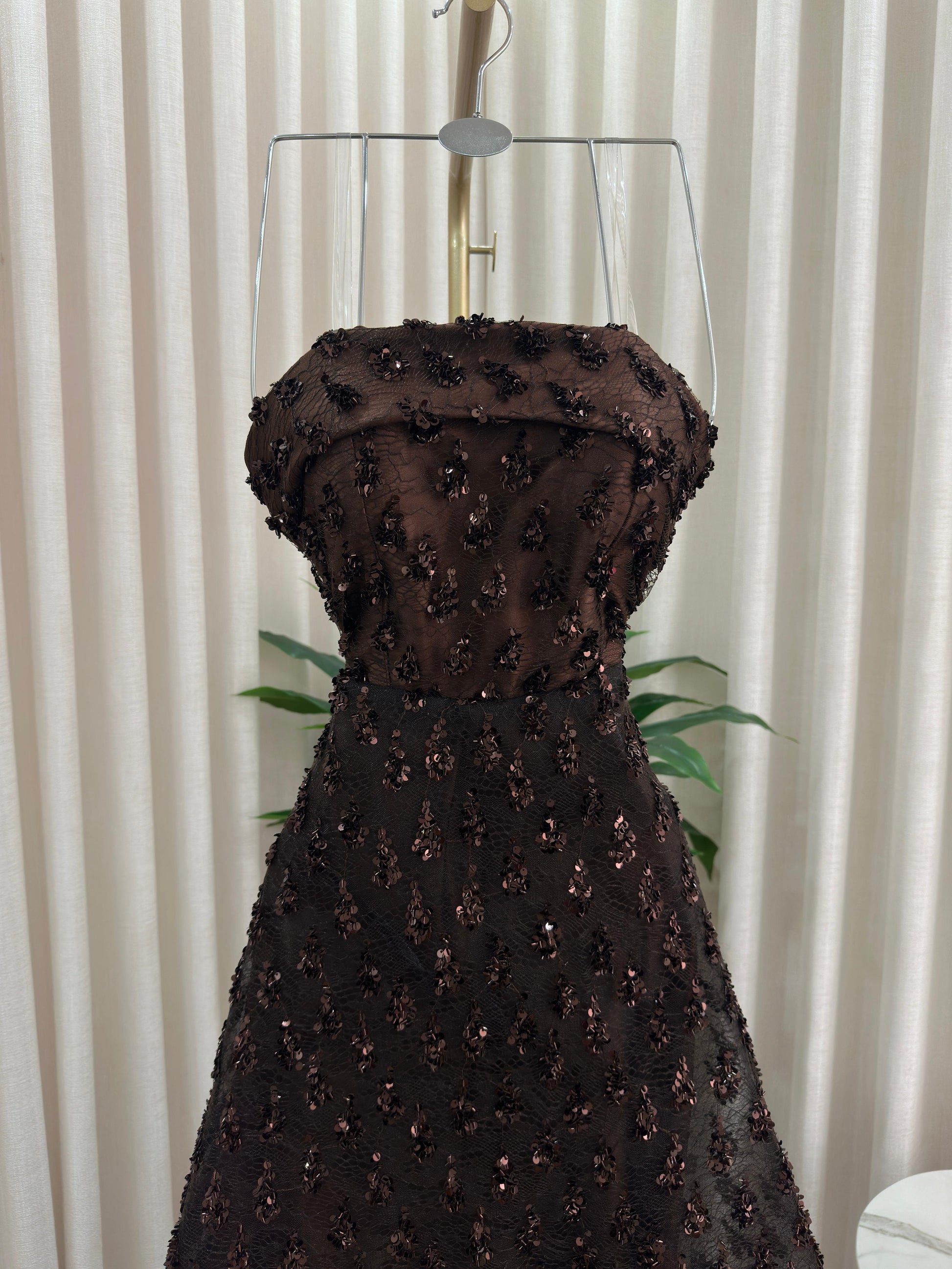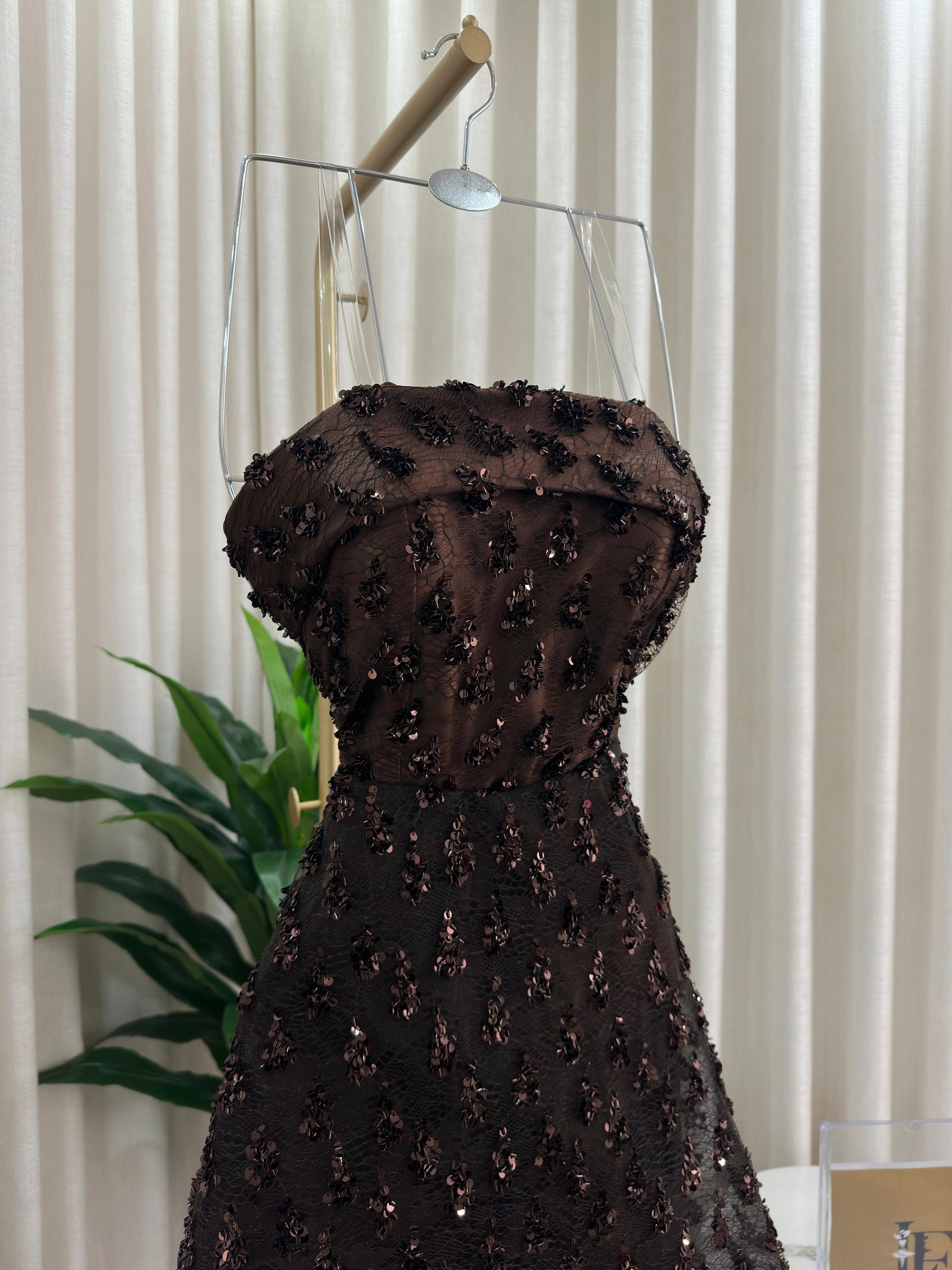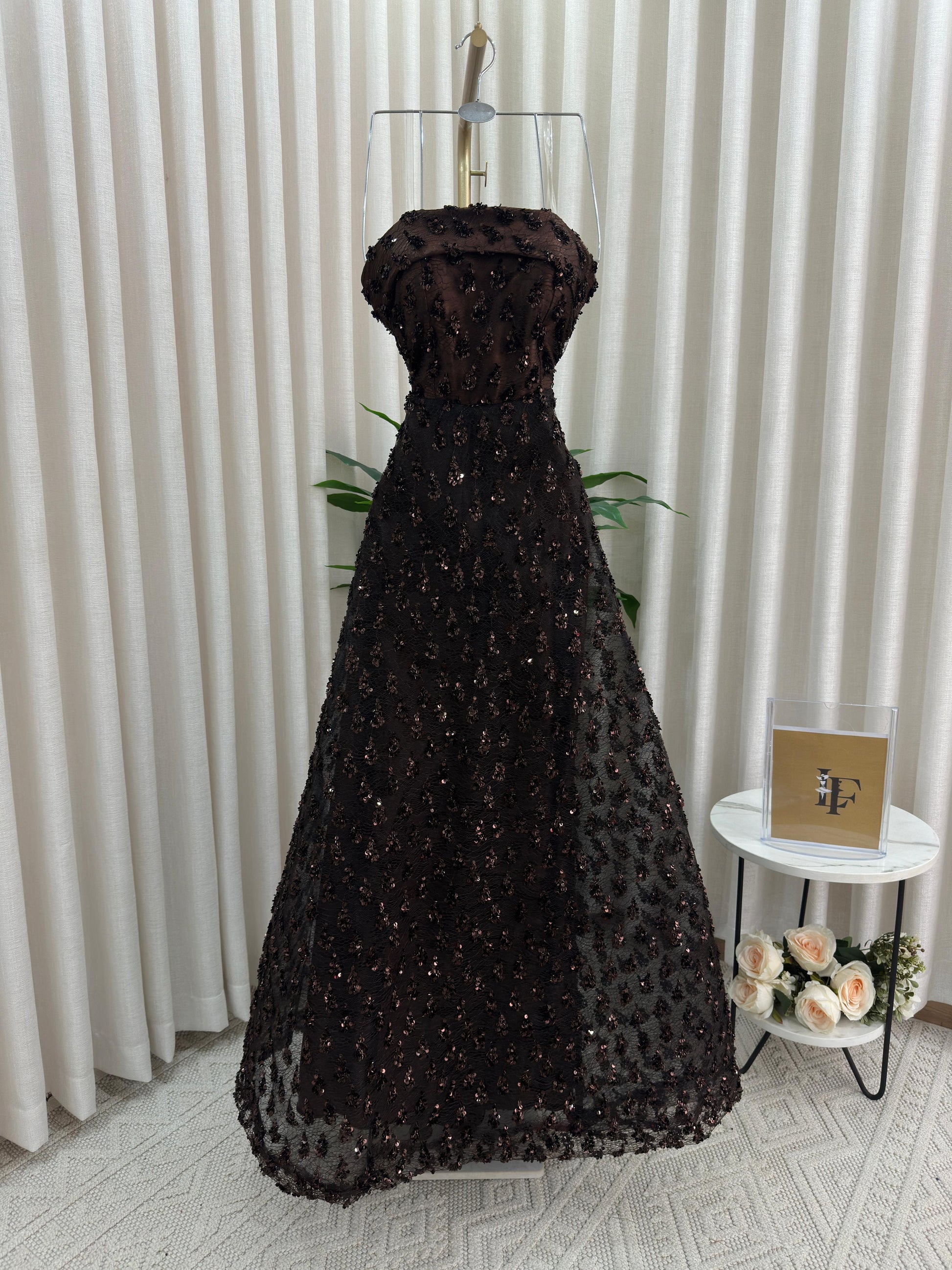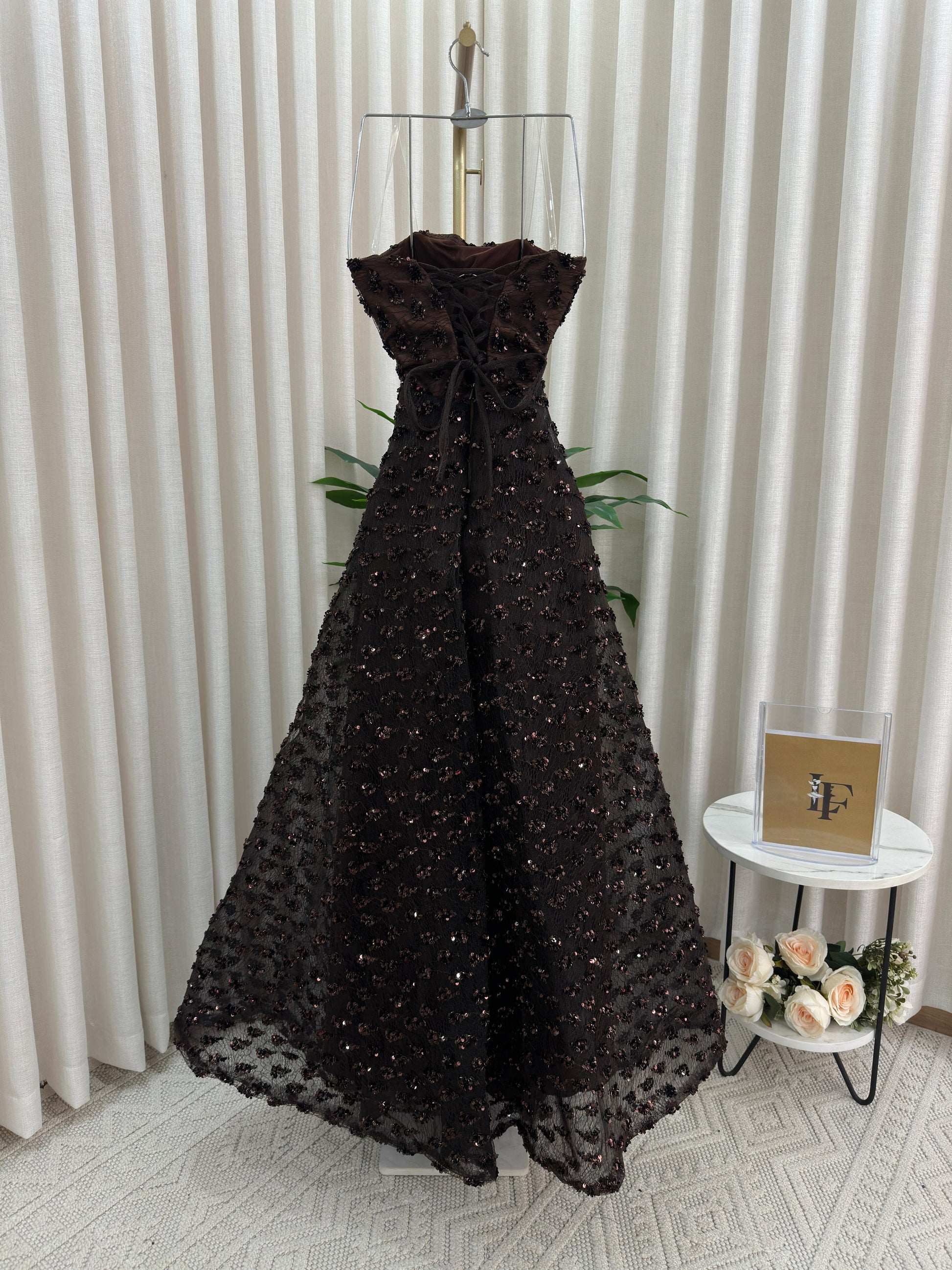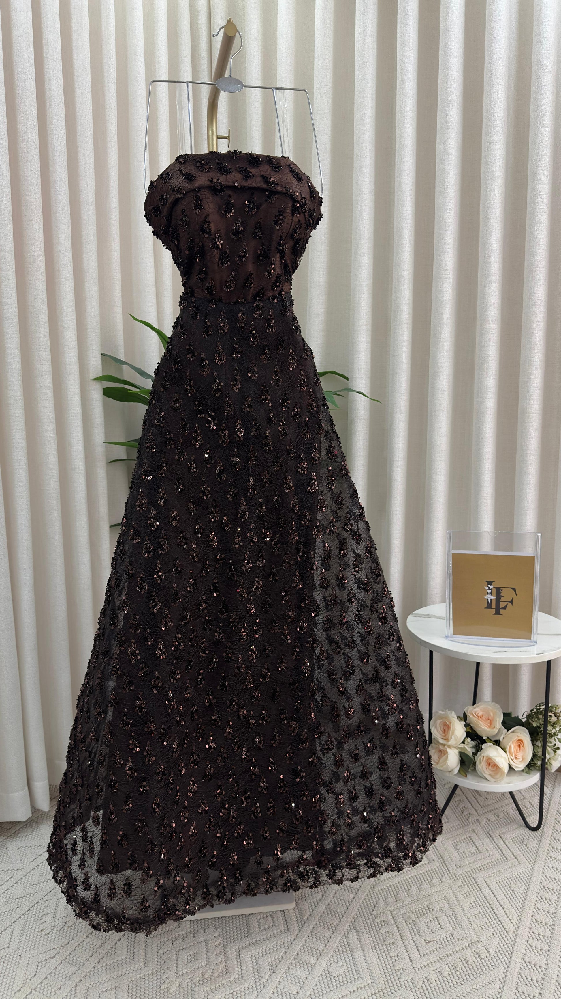 مو لازم الأسود! هذا الفستان يثبت إن البني الداكن هو لون الرقي والترف اللي يخلي إطلالتك غير مكررة ومميزة. فستان سهرة ساحر ومختلف لكل من تبحث عن طلة دافئة وفخمة.