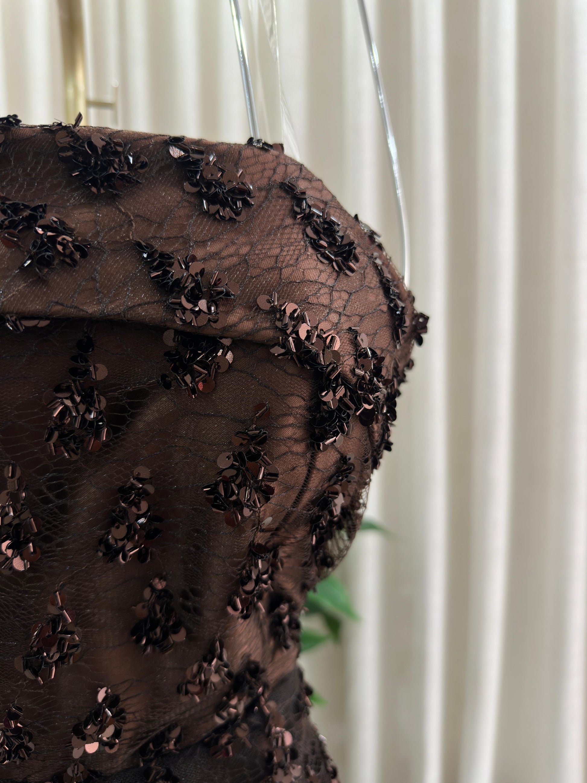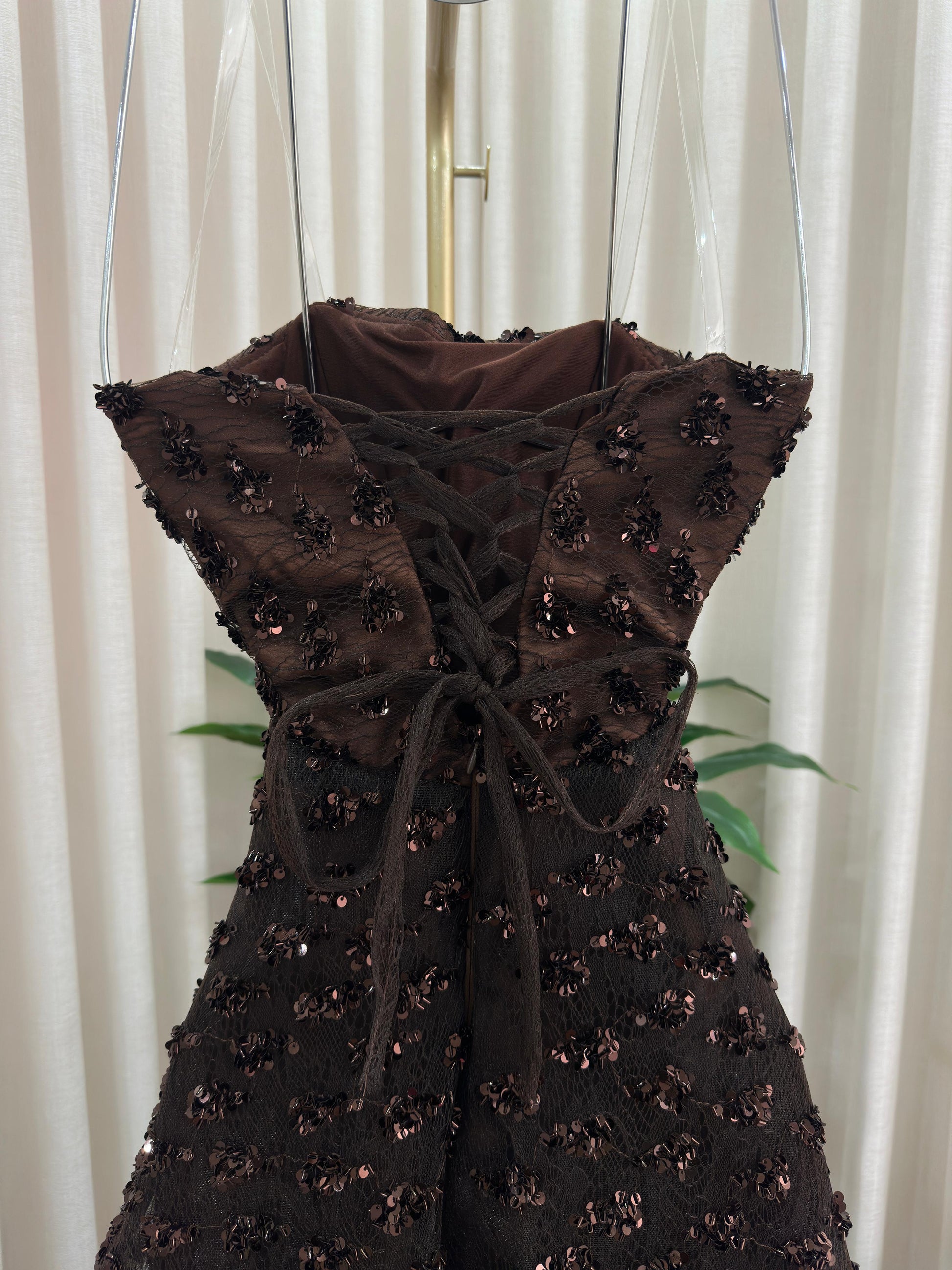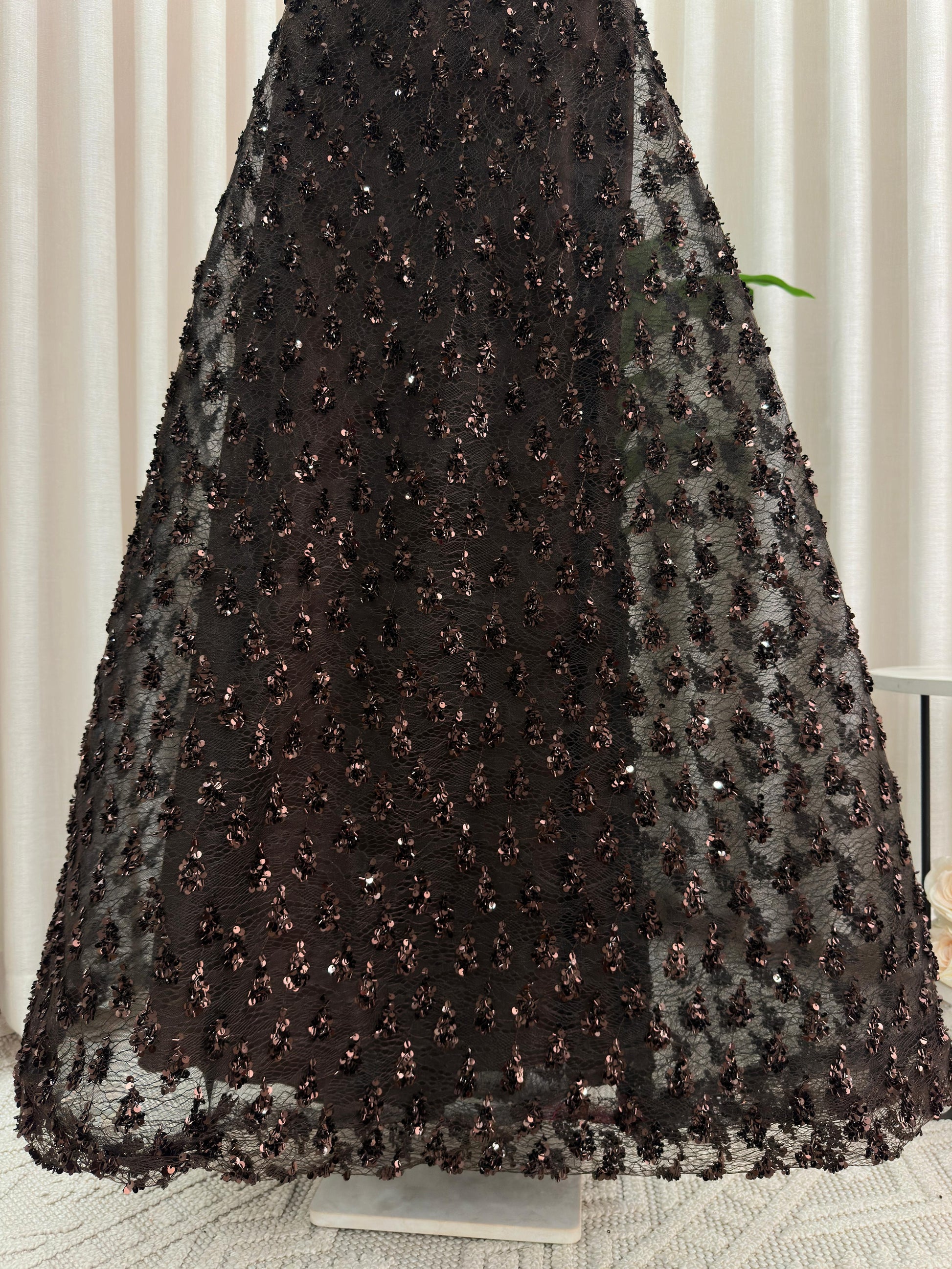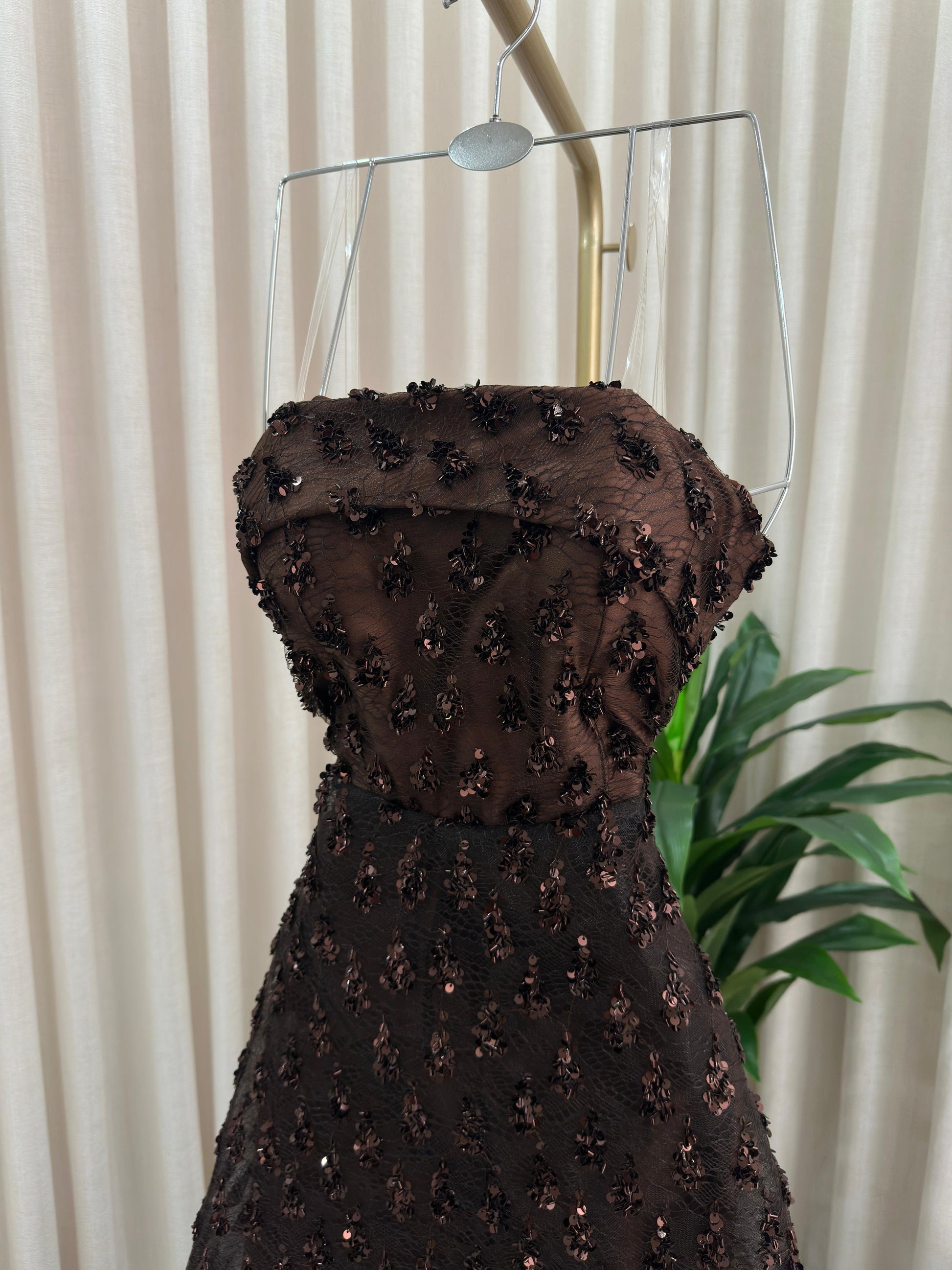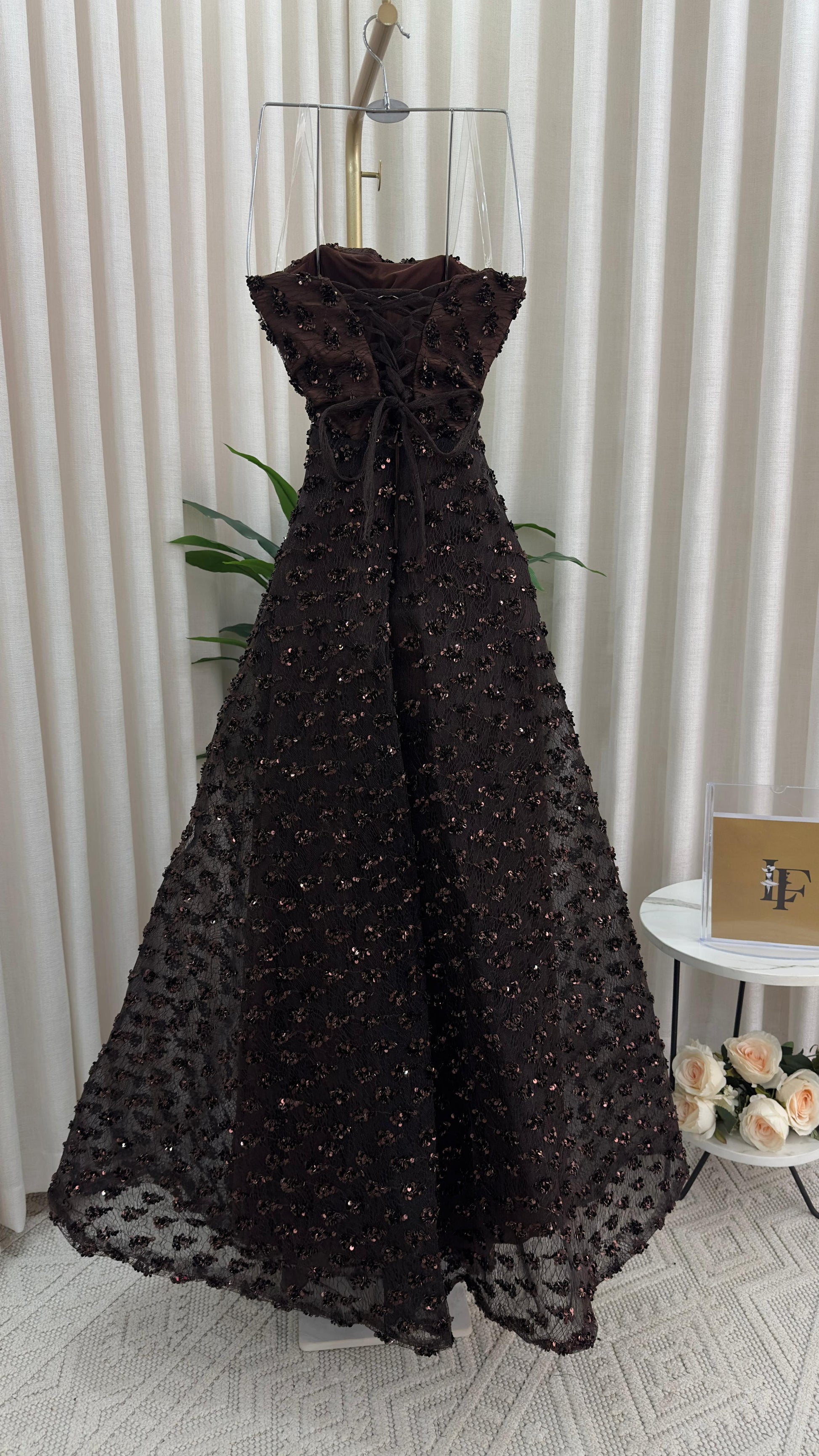 مو لازم الأسود! هذا الفستان يثبت إن البني الداكن هو لون الرقي والترف اللي يخلي إطلالتك غير مكررة ومميزة. فستان سهرة ساحر ومختلف لكل من تبحث عن طلة دافئة وفخمة.