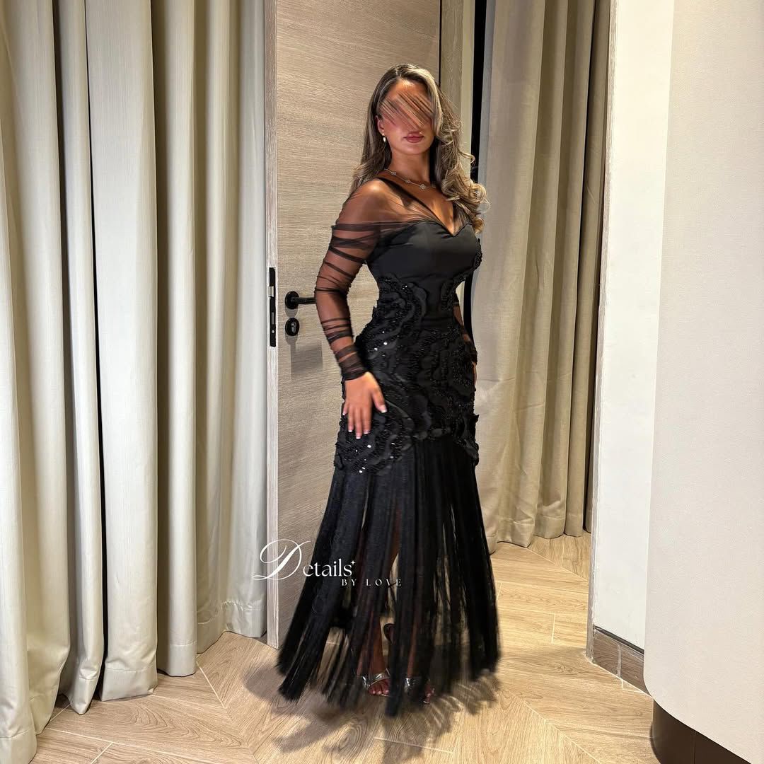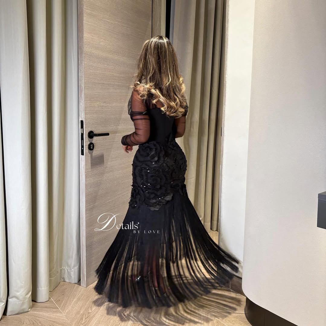 يتميز الفستان بقصة كورسيه أنيقة تبرز جمال الخصر، مع أكمام شفافة تضفي لمسة من الأنوثة والغموض. الجزء السفلي مصمم بقصّة منفوشة من قماش التول الشفاف اللي يعطي إحساس بالحركة والانسيابية.