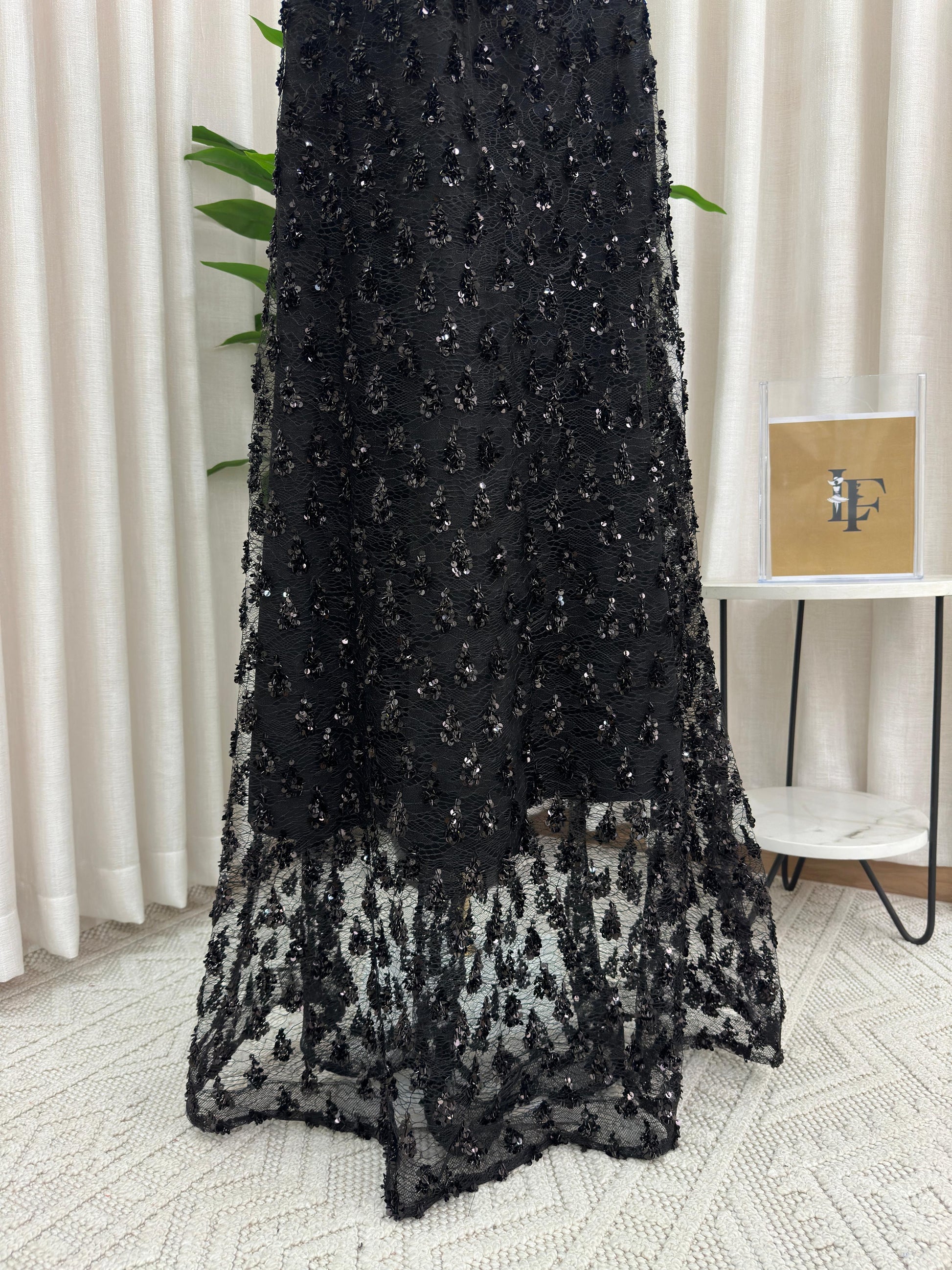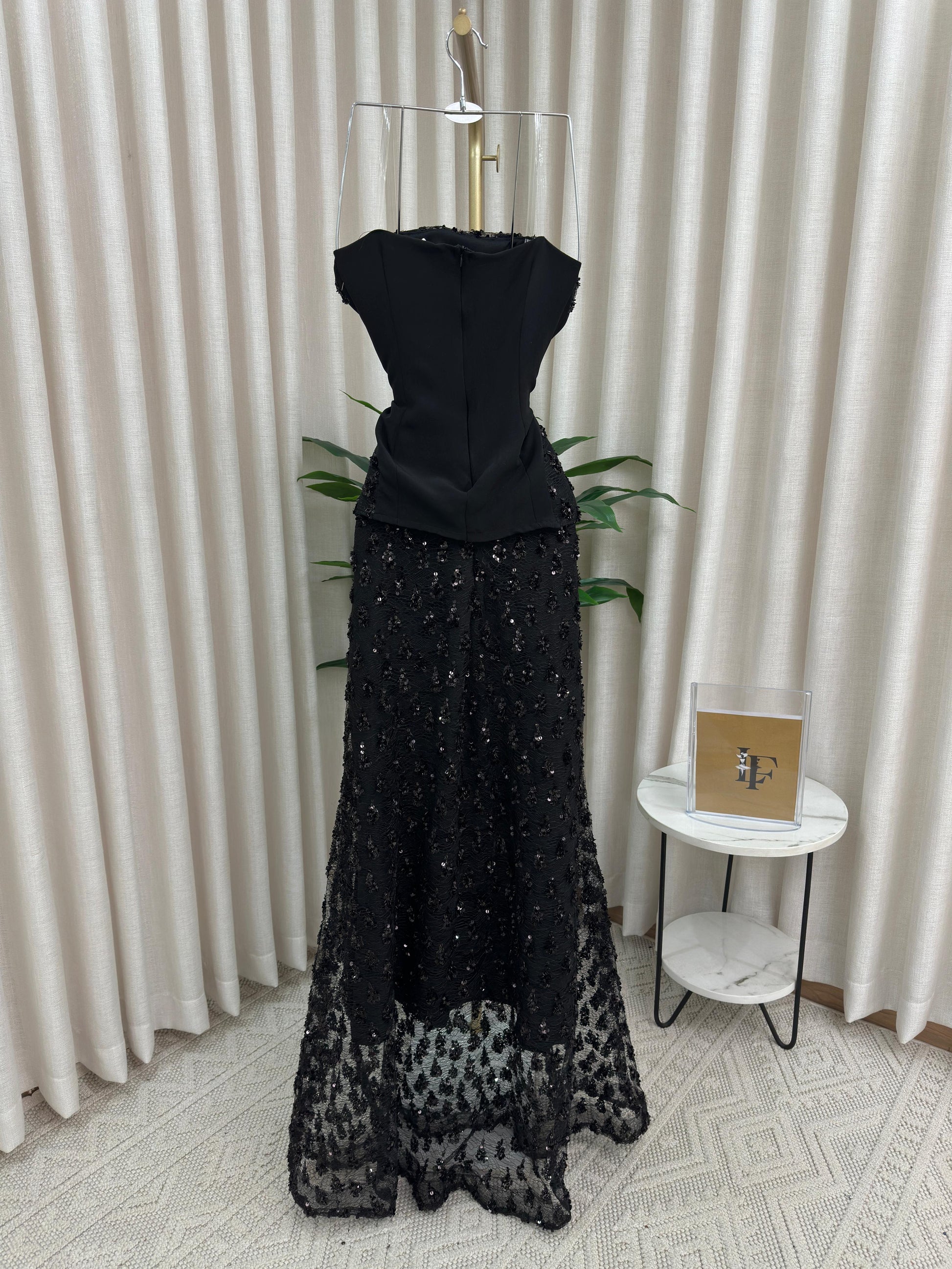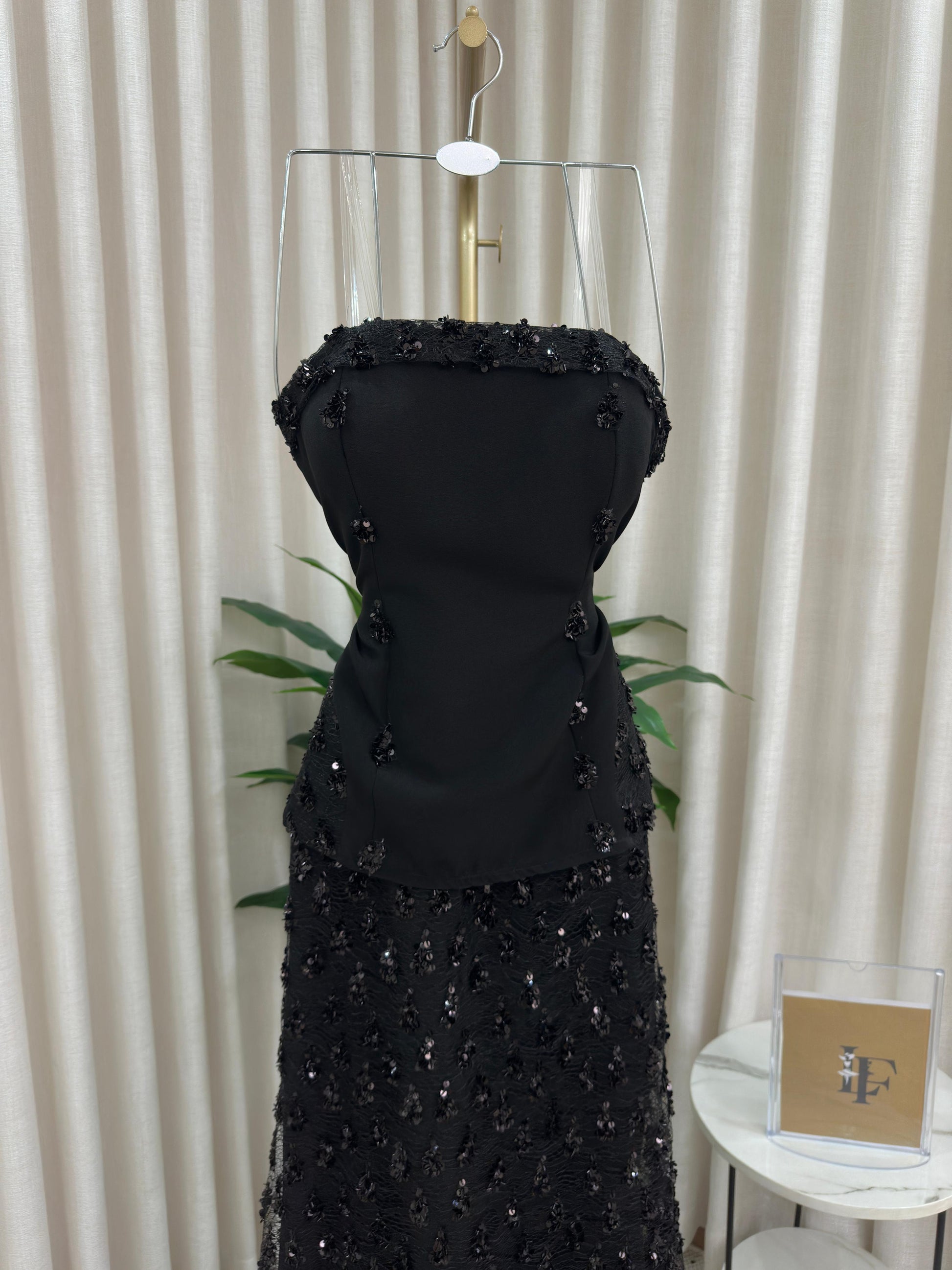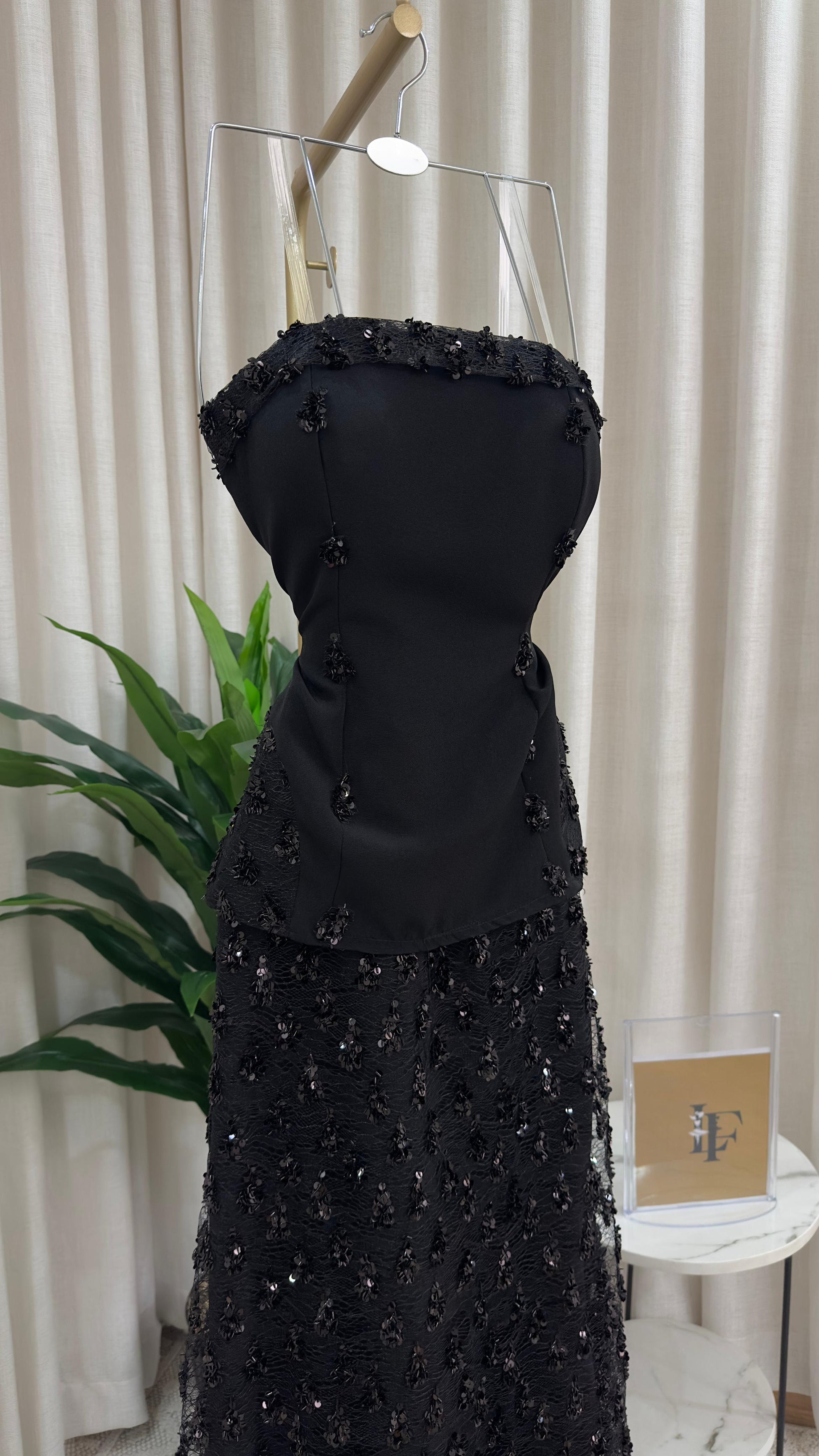 التنورة واللمسة الساحرة: النجامة كلها في التنورة الطويلة اللي تحت. شوفوا كيف جاية بقماش تول أسود مطرز بتطريزات براقة ولامعة على شكل ورود أو نقوش راقية. التطريز هذا موزع بتركيز كثيف ويخلي التنورة تلمع مع كل خطوة. القصة ضيقة من فوق وتنسدل على واسع من تحت بشكل راقي، تعطي جسم مشدود وطلة ملكية.
