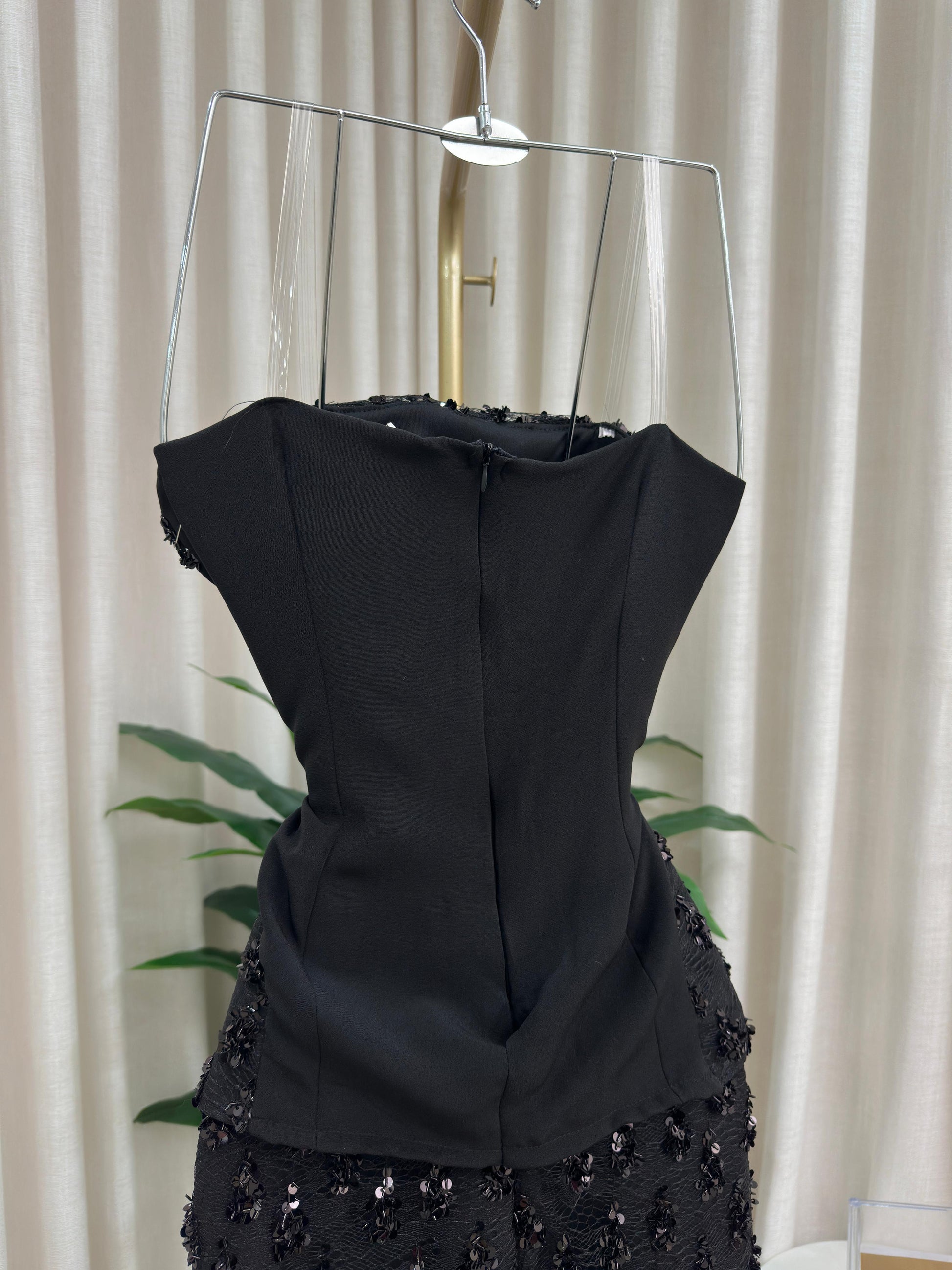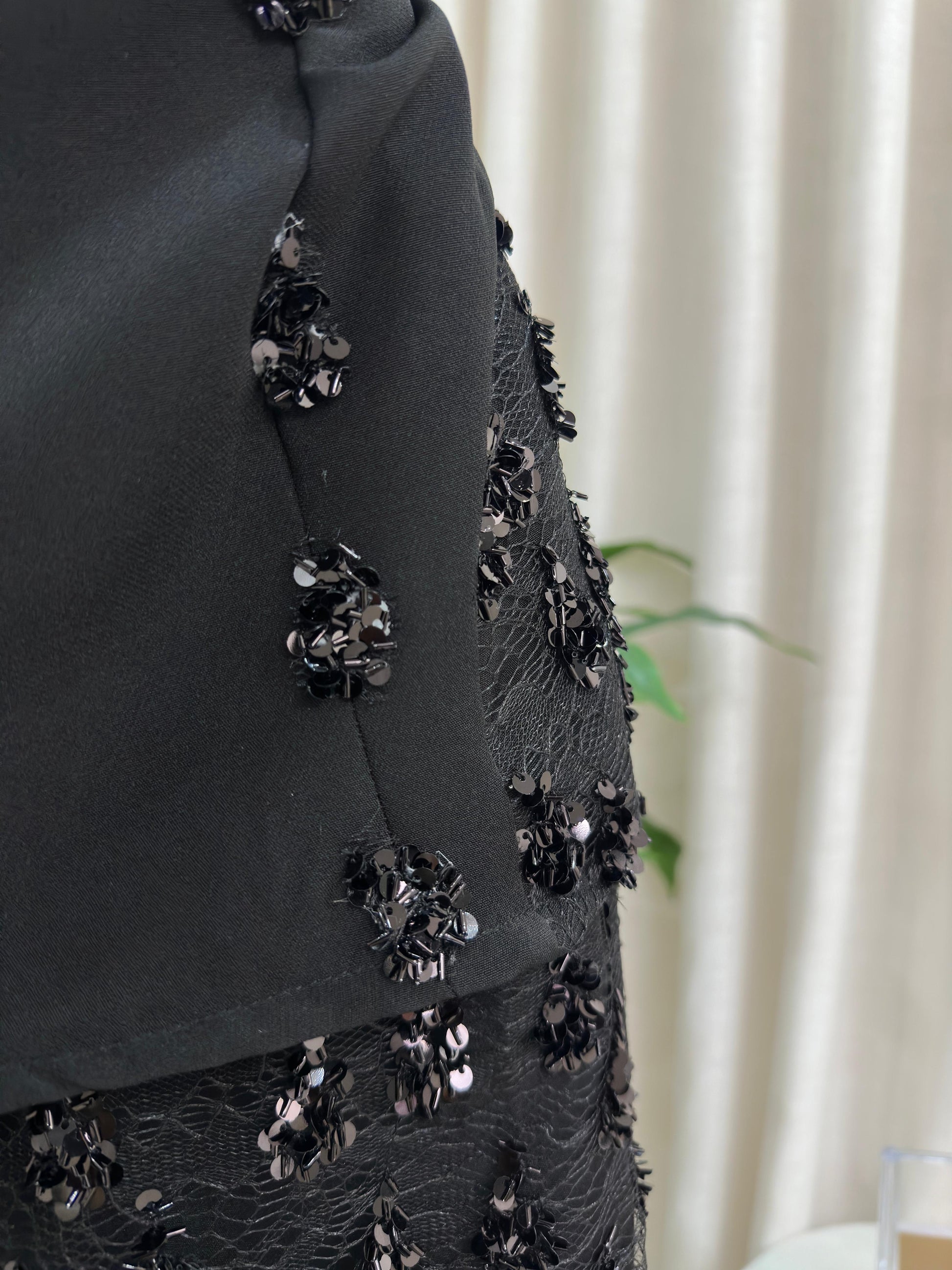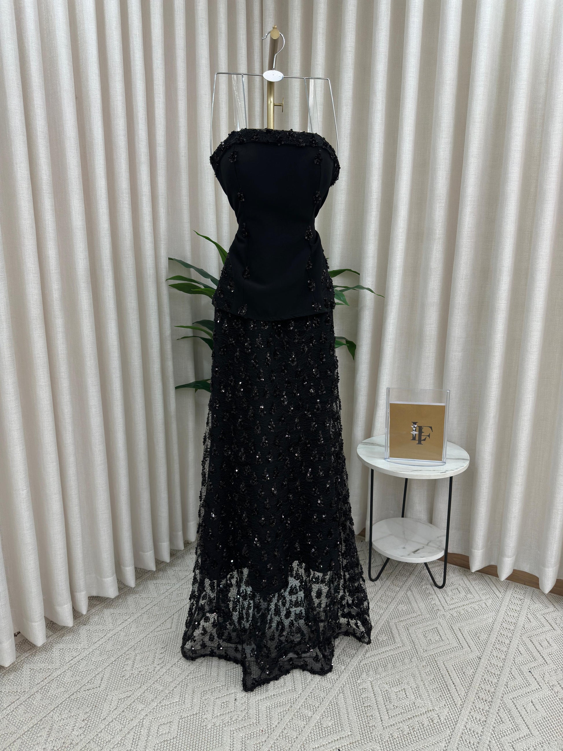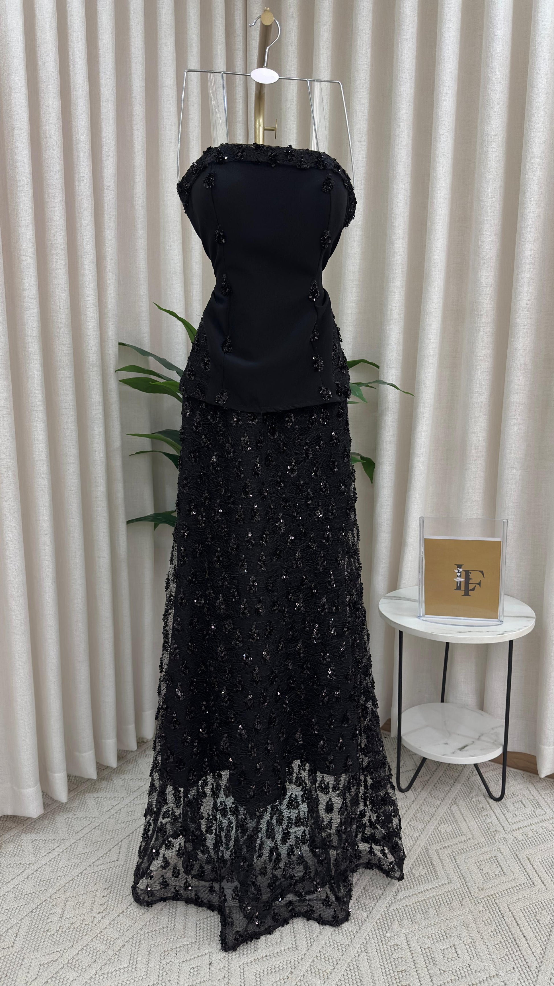 التنورة واللمسة الساحرة: النجامة كلها في التنورة الطويلة اللي تحت. شوفوا كيف جاية بقماش تول أسود مطرز بتطريزات براقة ولامعة على شكل ورود أو نقوش راقية. التطريز هذا موزع بتركيز كثيف ويخلي التنورة تلمع مع كل خطوة. القصة ضيقة من فوق وتنسدل على واسع من تحت بشكل راقي، تعطي جسم مشدود وطلة ملكية.