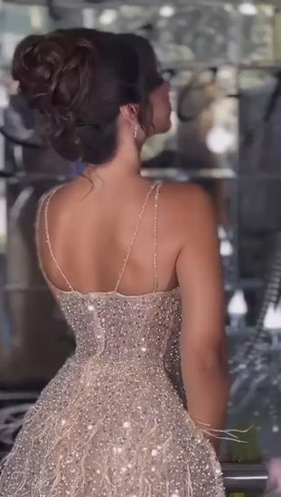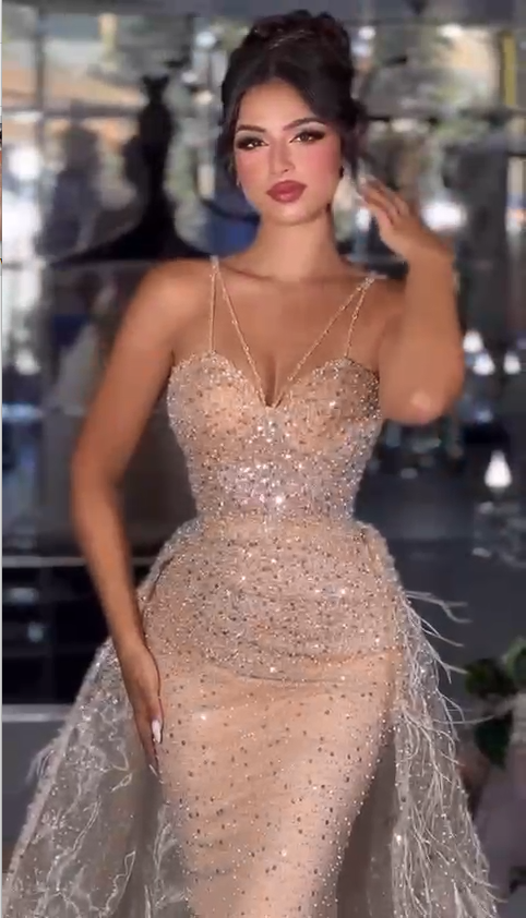الفستان يجي بقصة حورية البحر (ميرميد) اللي تبرز جمال القوام. الصدر مصمم على شكل كورسيه ومرصع بالكامل بالترتر والكريستال اللامع، يضيف إضاءة وجاذبية.