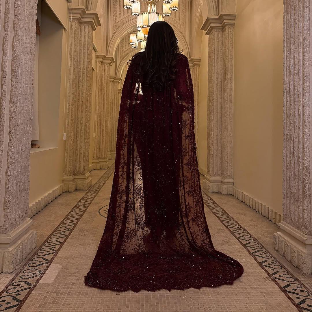 التفاصيل: الجزء السفلي من الفستان (التنورة) طويل بقصة "حورية البحر" (Mermaid) الضيقة، مطرز بالكامل بترتر أو كريستال دقيق يلمع "لمعة" خفيفة وراقية مع الحركة، وهذي هي الفخامة اللي ندور عليها.