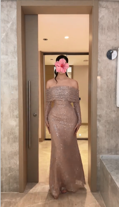القماش اللامع مغطى بالكامل بالترتر والكريستال اللي يلمع تحت الأضواء، وقصته ضيقة تتبع شكل الجسم لإبراز جمال القوام.