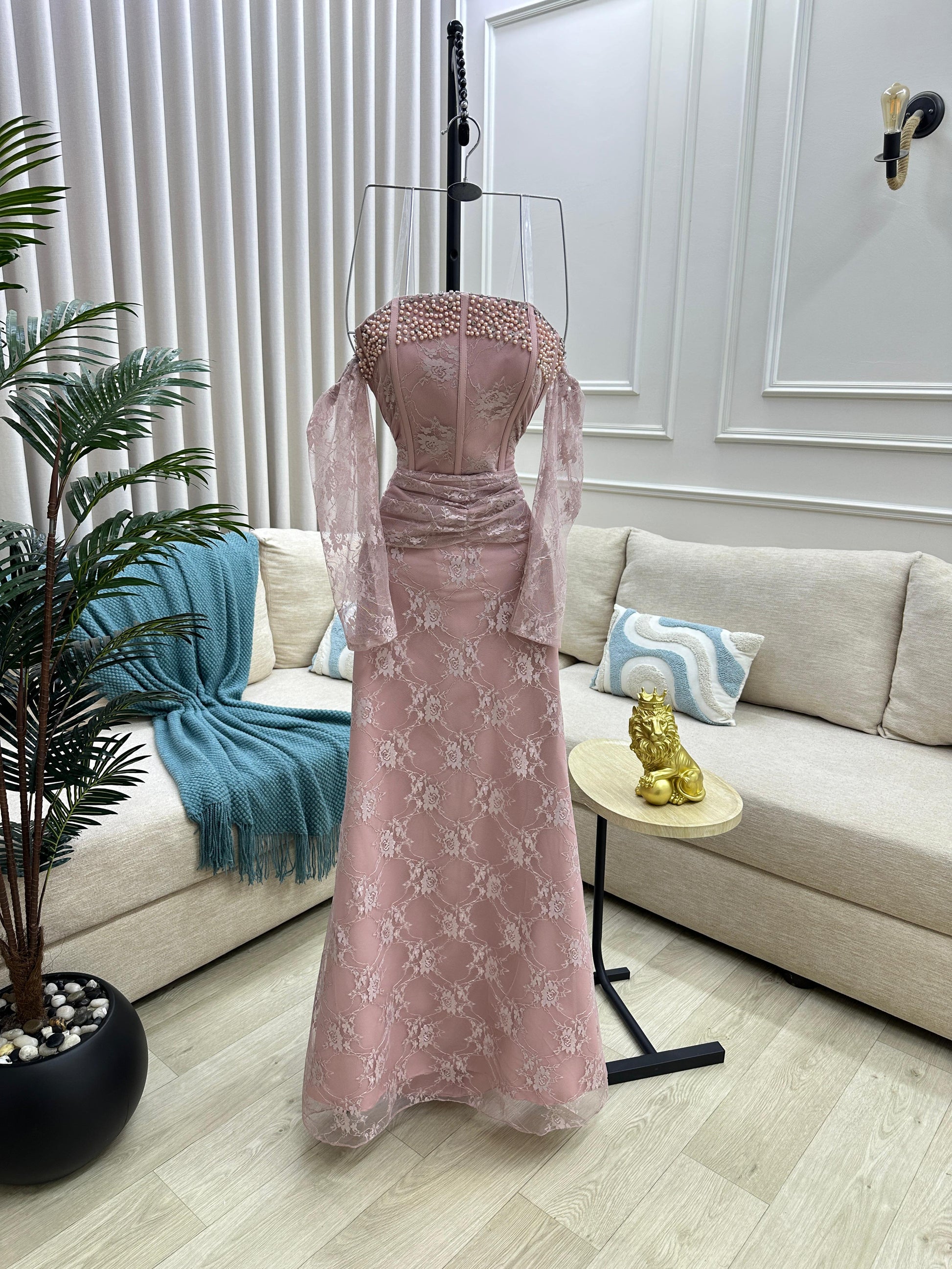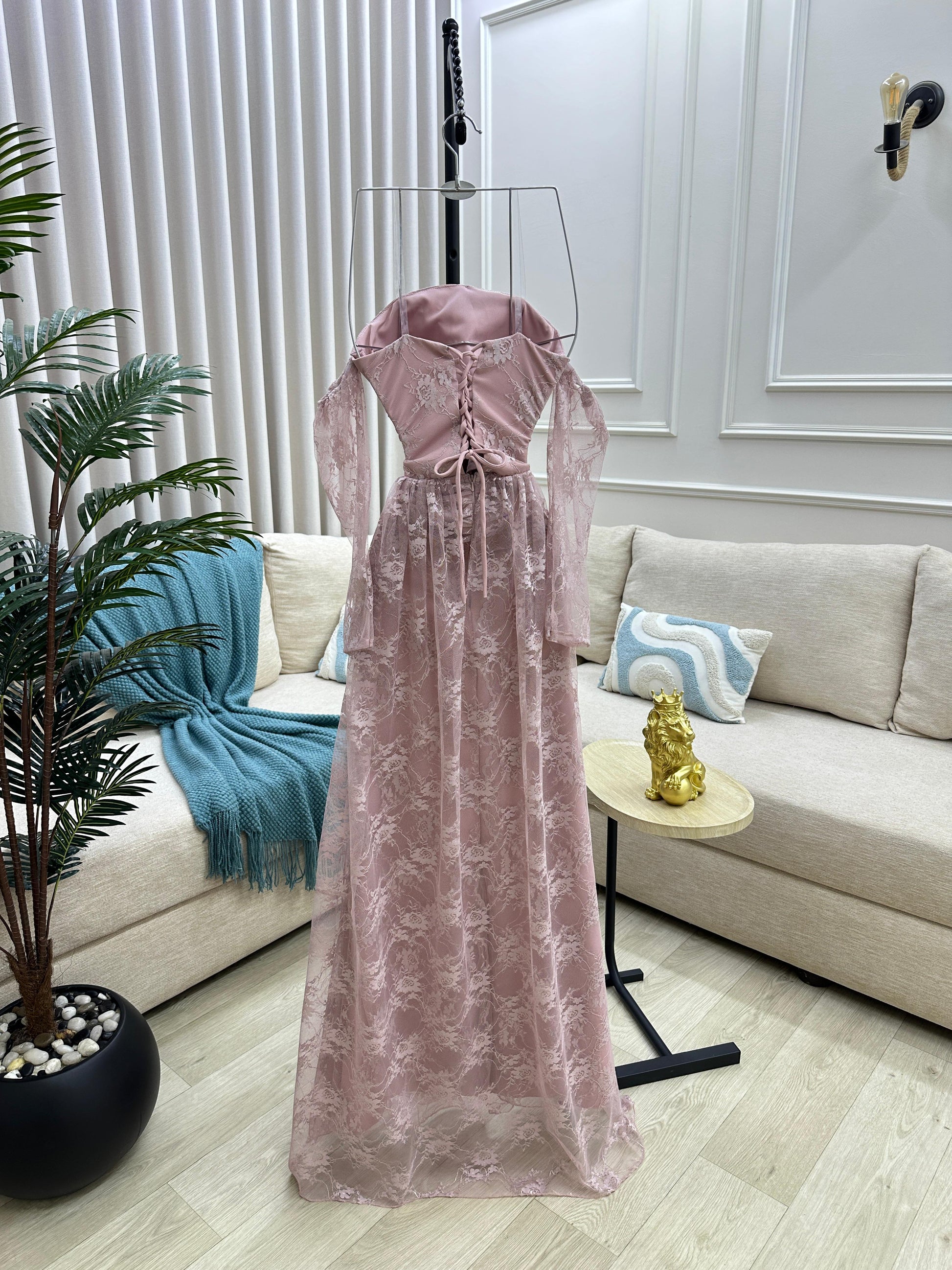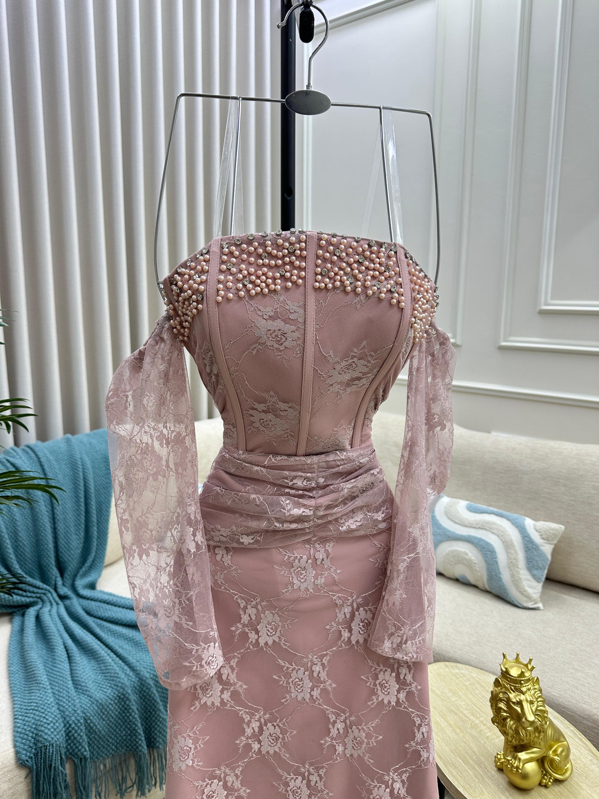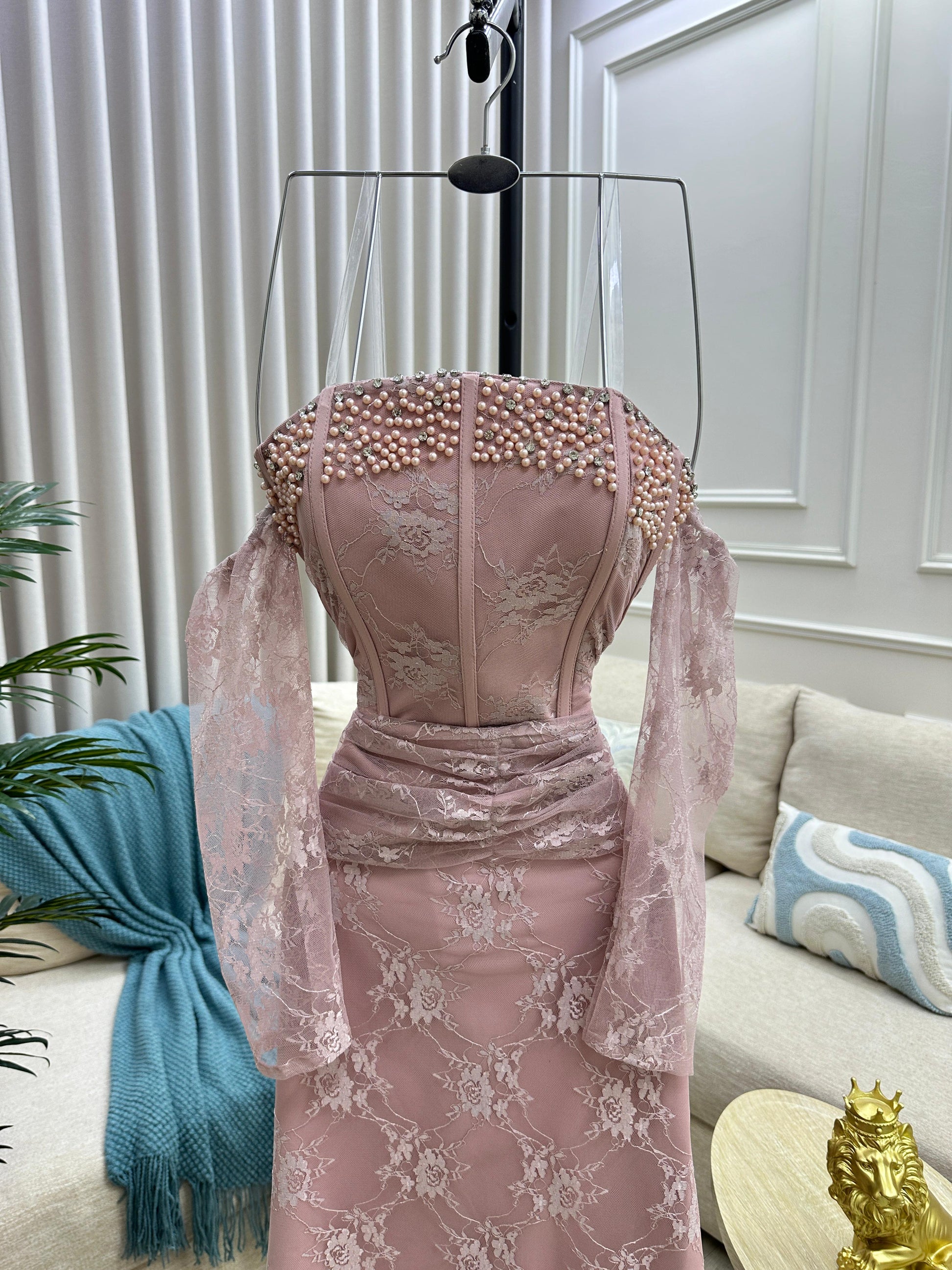 اللون والتصميم: يتميز الفستان بلون وردي فاتح هادئ وجذاب. يأتي بتصميم Off-shoulder (أكتاف مكشوفة) يبرز جمال الكتفين والرقبة، مع أكمام طويلة من الدانتيل الشفاف تضيف لمسة من الرقة والجاذبية.