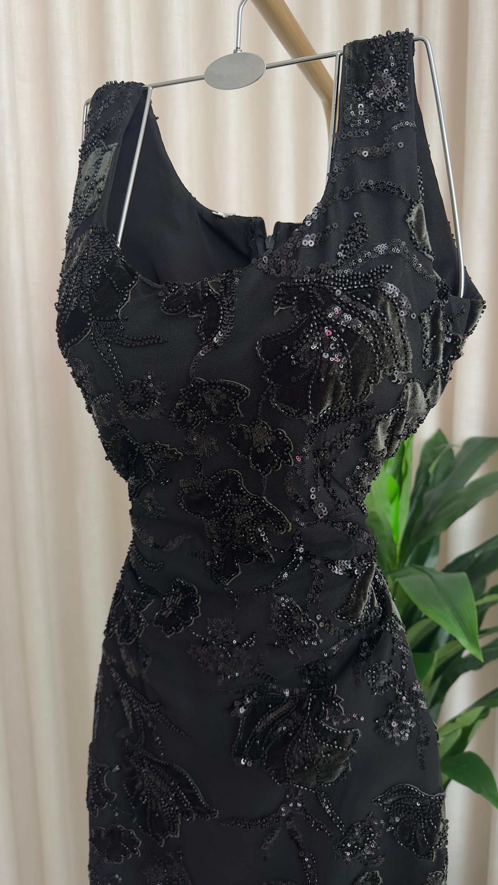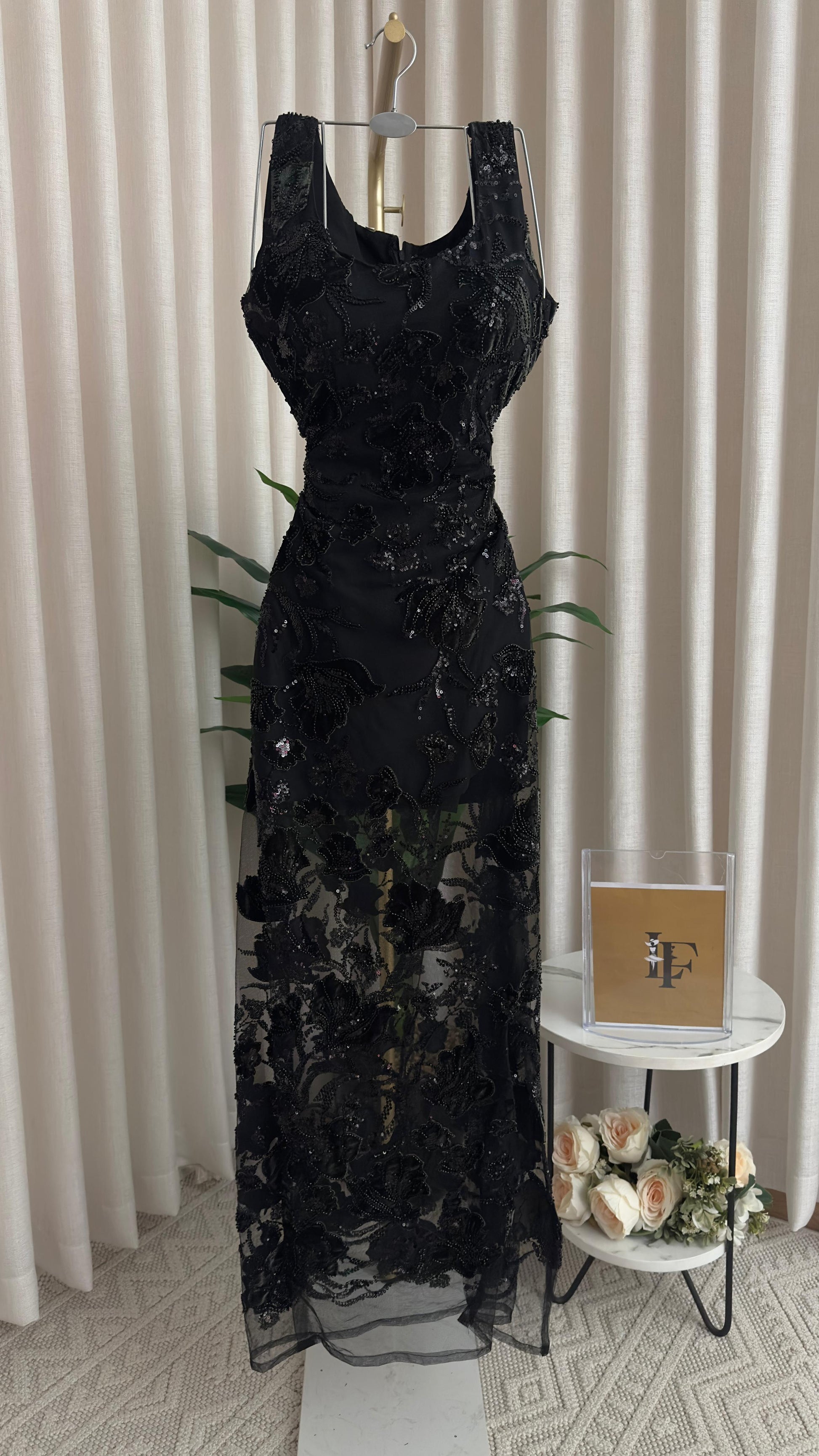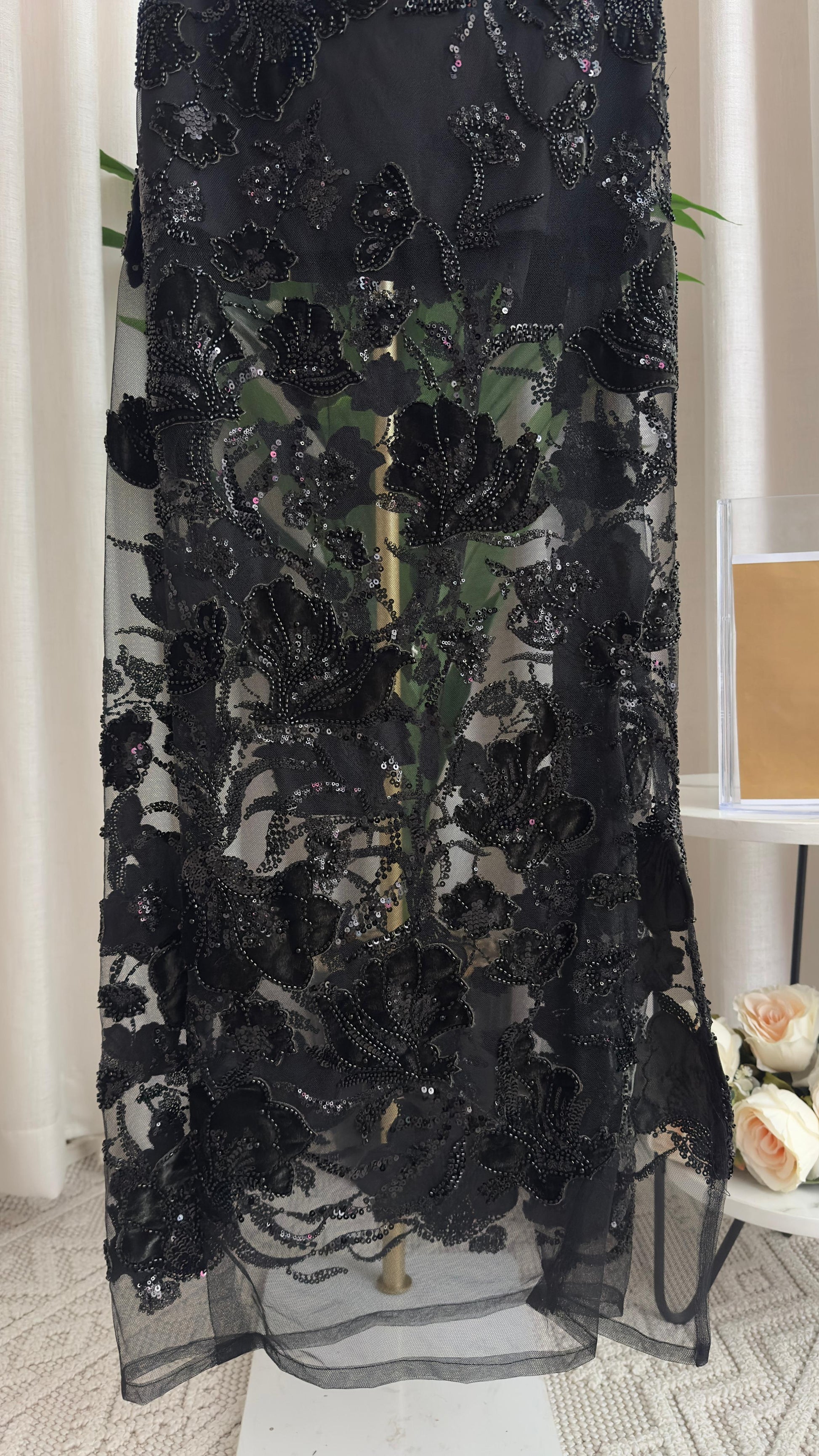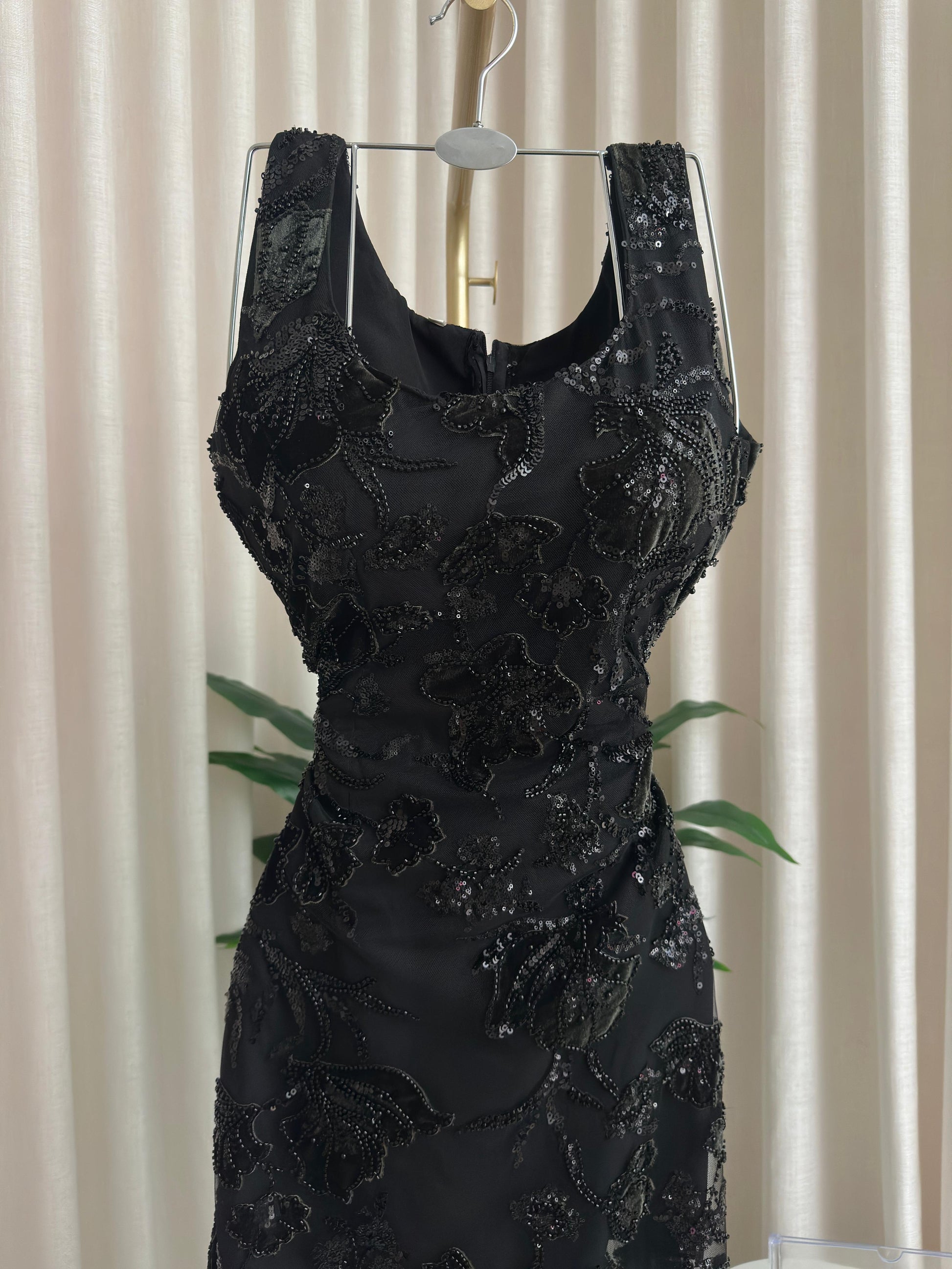 • القصة والتطريز: فستان بقصّة حورية البحر (Mermaid) اللي تبرز جمال القوام بشكل مبهر. الفستان بالكامل مغطى بخرز وكريستال لامع يوزع الضوء بشكل قوي.