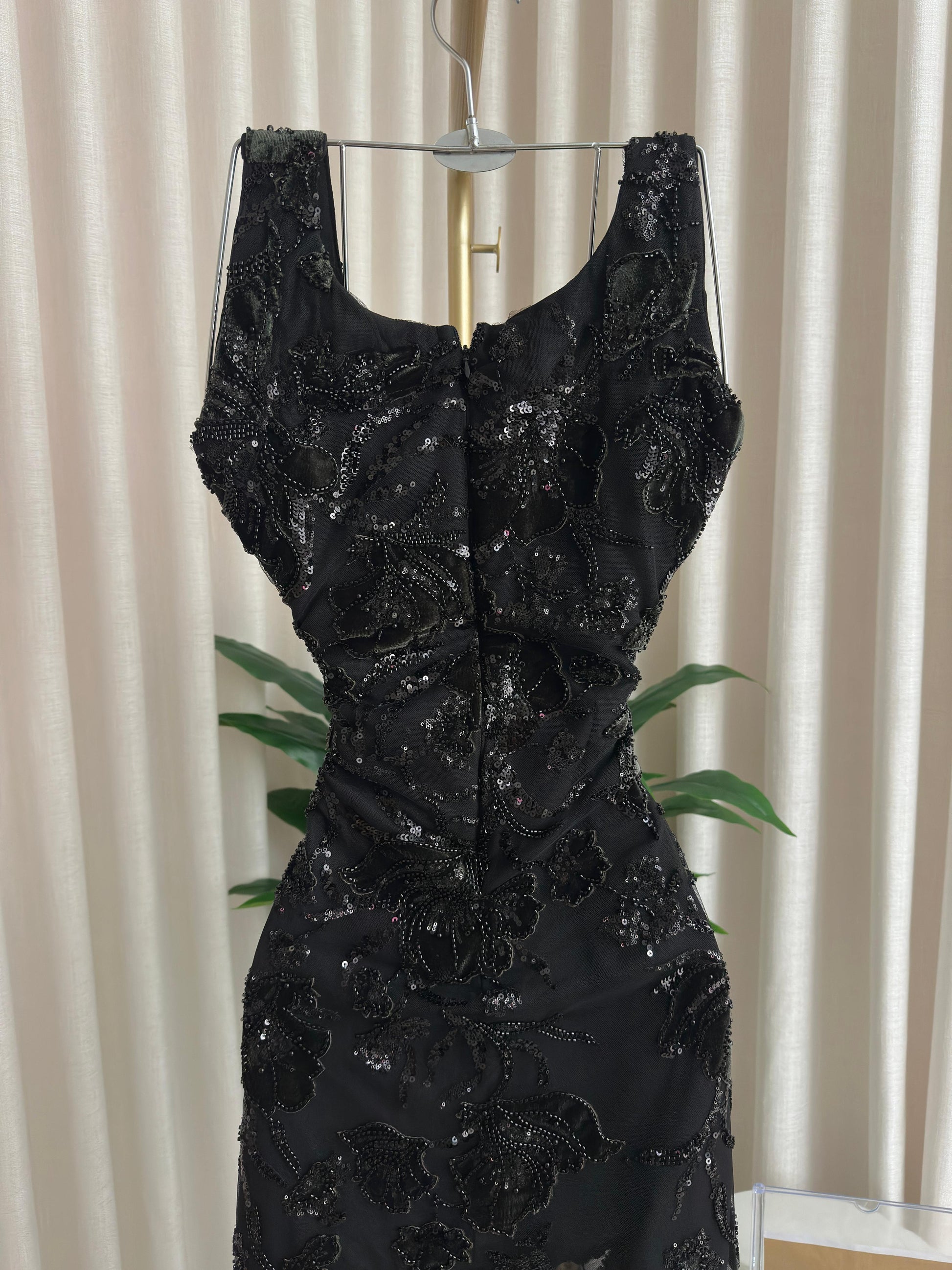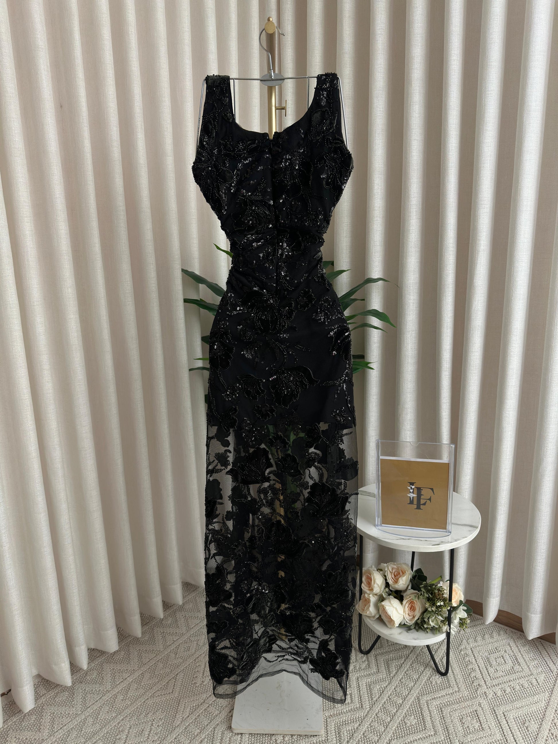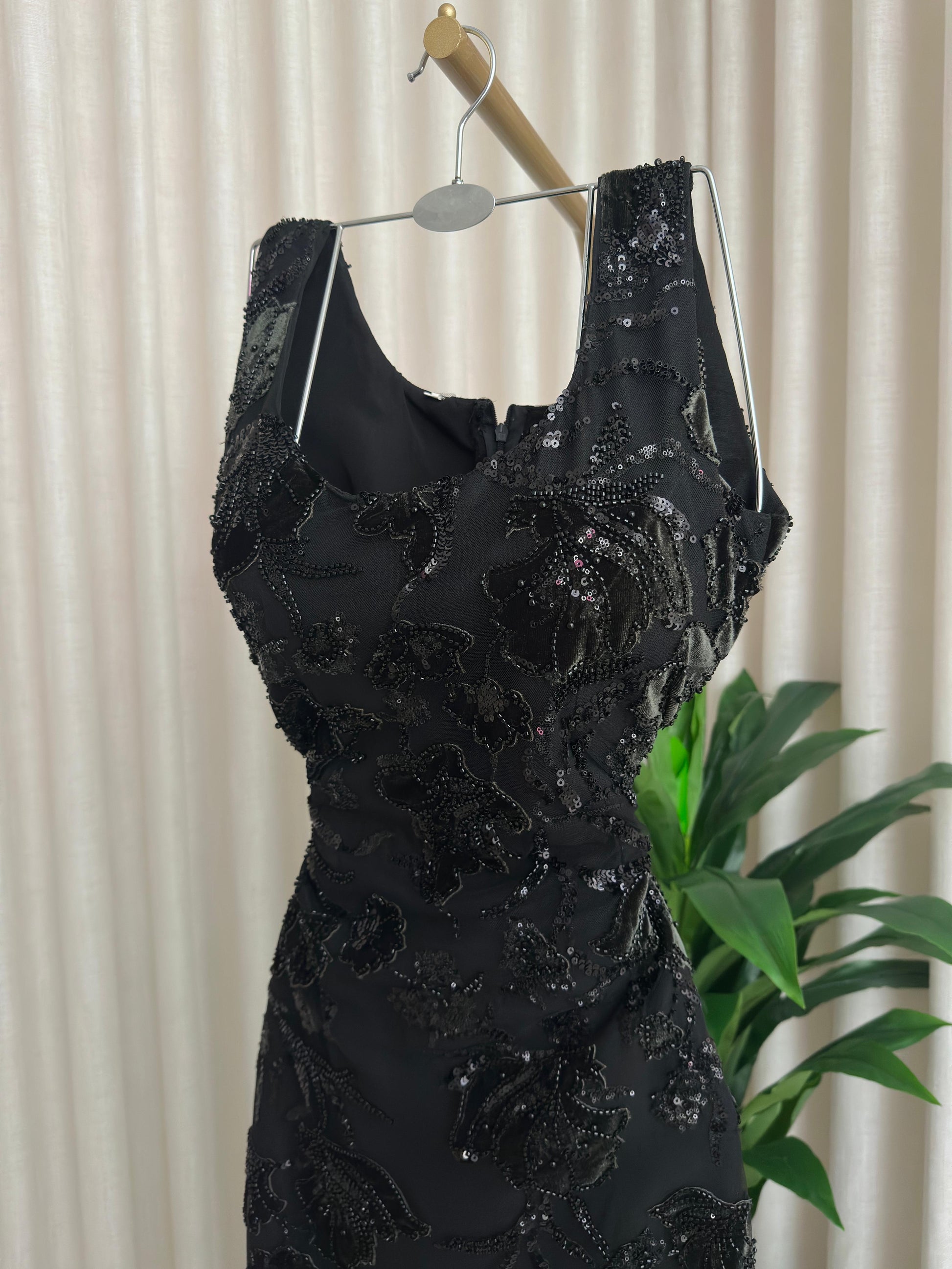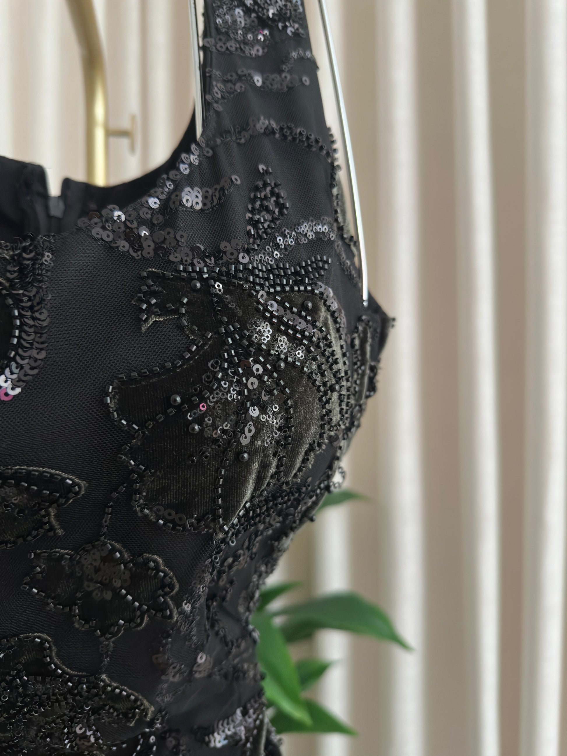 • القصة والتطريز: فستان بقصّة حورية البحر (Mermaid) اللي تبرز جمال القوام بشكل مبهر. الفستان بالكامل مغطى بخرز وكريستال لامع يوزع الضوء بشكل قوي.