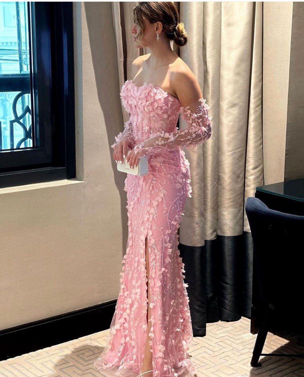 هذا الفستان يجسد أحلام الأنوثة! الزهور الثلاثية الأبعاد تعطيه حيوية، وقصّة الميرميد مع فتحة الساق تضمن لكِ طلة جريئة وأنيقة في آن واحد. مثالي لـحفلات الخطوبة، والسهرات الراقية، أو مناسبات الزفاف.