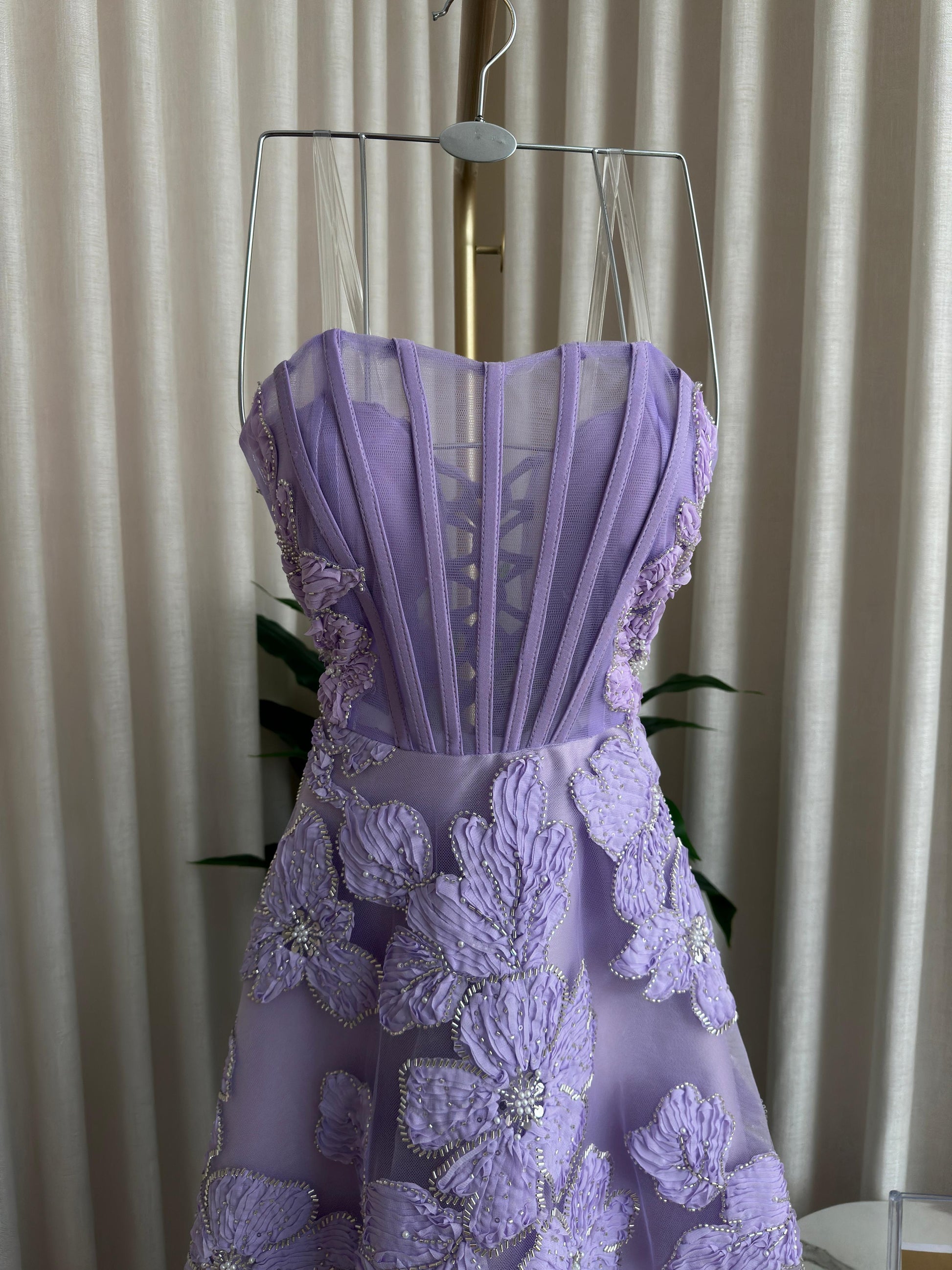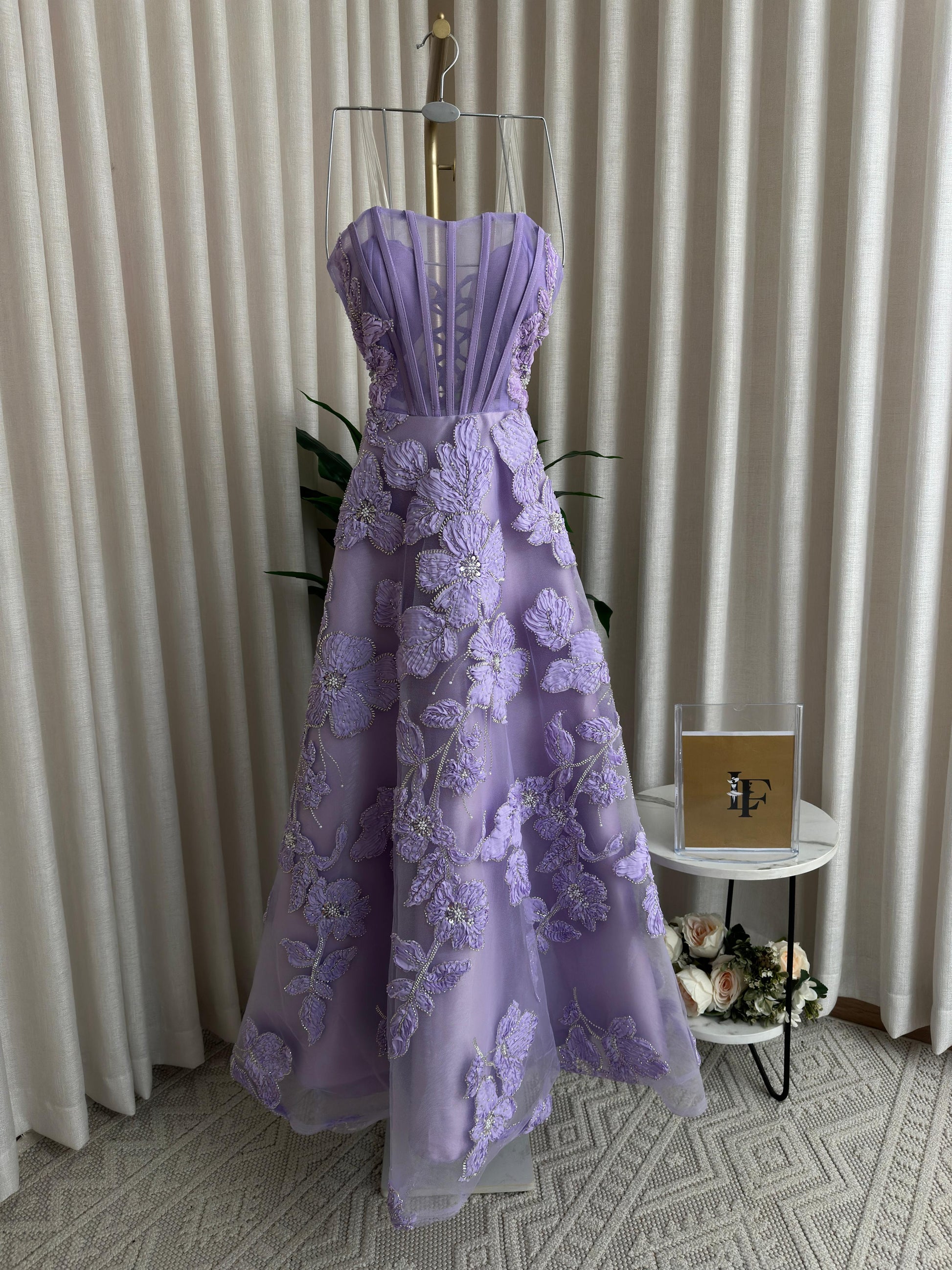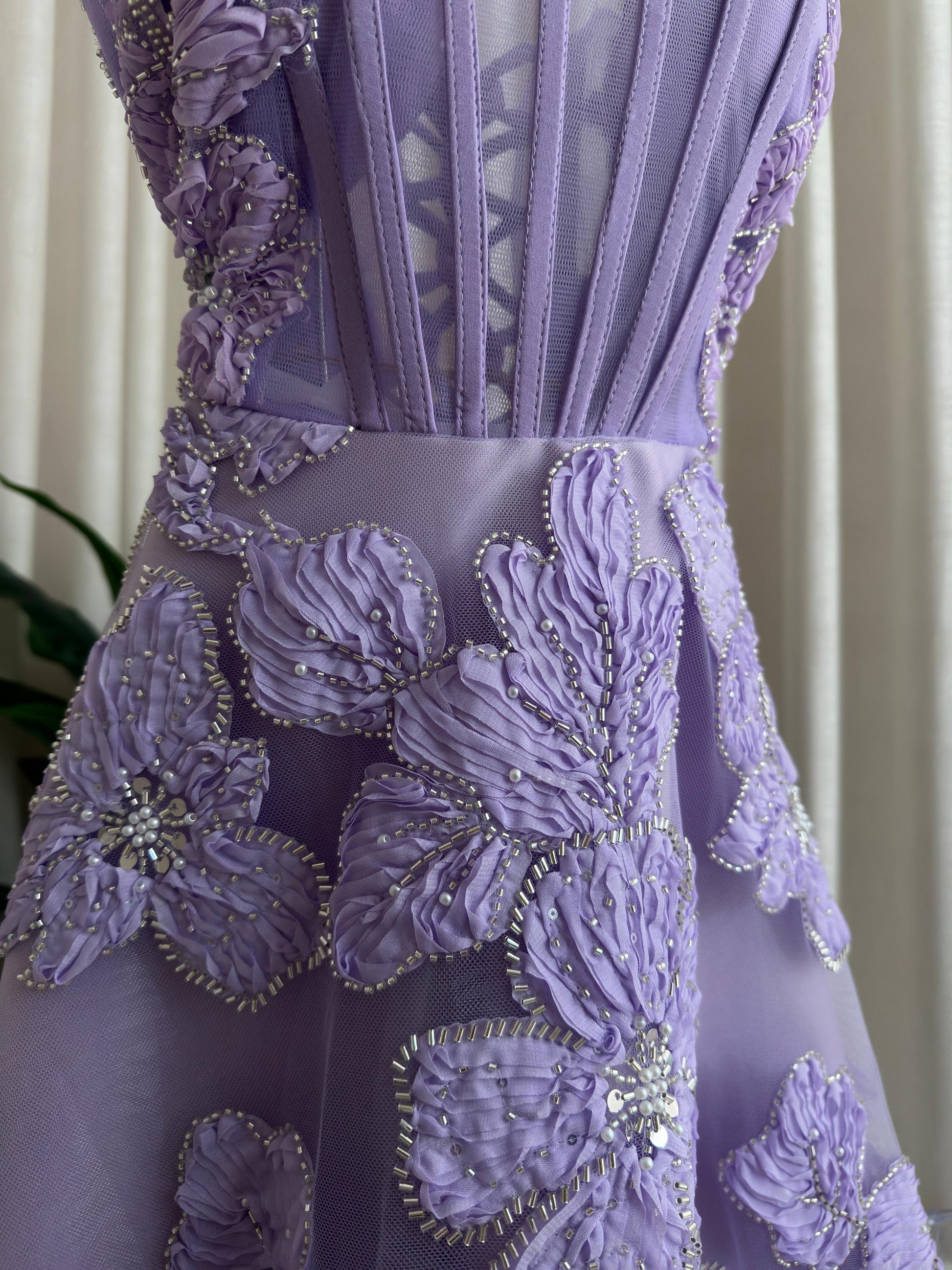 هذا الفستان يجسد الأنوثة المطلقة! التصميم المبتكر للكورسيه والتطريز الثلاثي الأبعاد على التنورة يخليكِ مثل زهرة متفتحة. مثالي لـحفلات الخطوبة، السهرات الصيفية، أو مناسبات الزواج اللي تتطلب طلة رقيقة وفخمة.